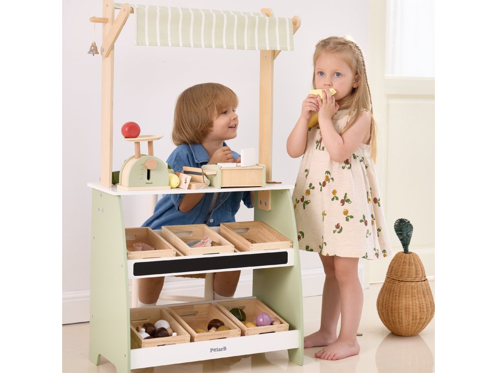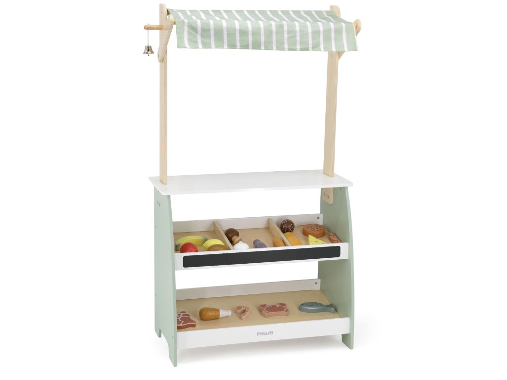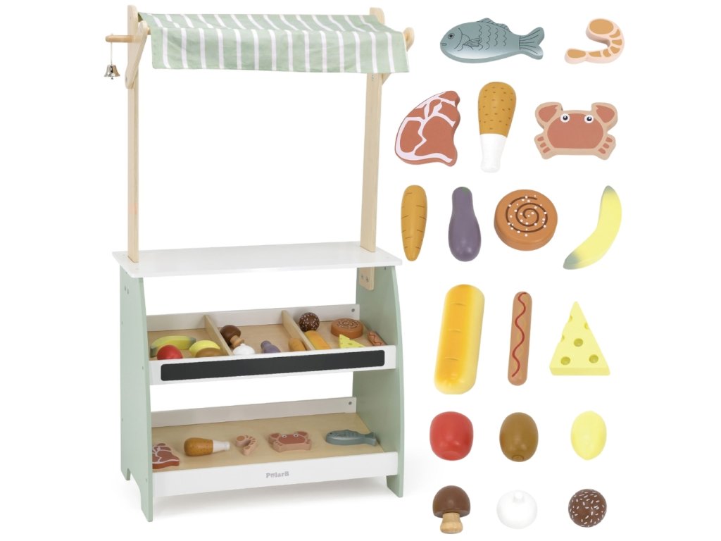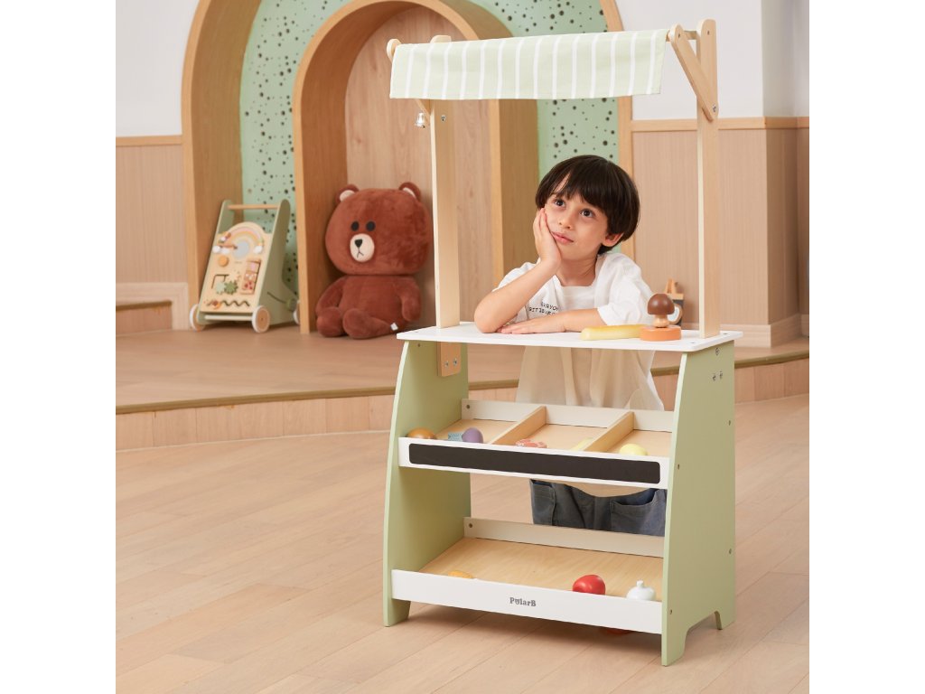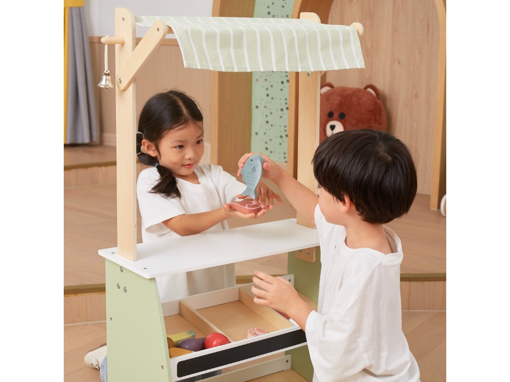 Drevený veľtržný stánok od značkyVIGA posunie zábavu pri hraní úlohy predajcu na vyššiu úroveň. Vyrobené na z masívneho dreva stánok vymaľovaný v pastelových odtieňoch zelenej určite očarí deti a stane sa obľúbeným miestom na hranie.Má dve policez ktorých horná je rozdelená na tri oddelené priestory, tkaninabaldachýn,malá tabuľa na popis položiek v predaji a zadávanie cien, ako aj malúrolnička upútať pozornosť zákazníkov.Vrátane 18 potravínktoré nedovolia, aby toto stojisko zostalo prázdne.