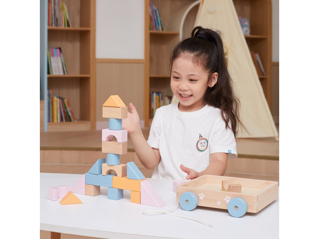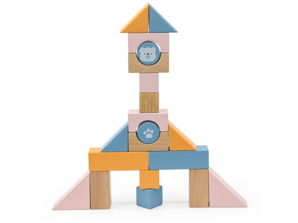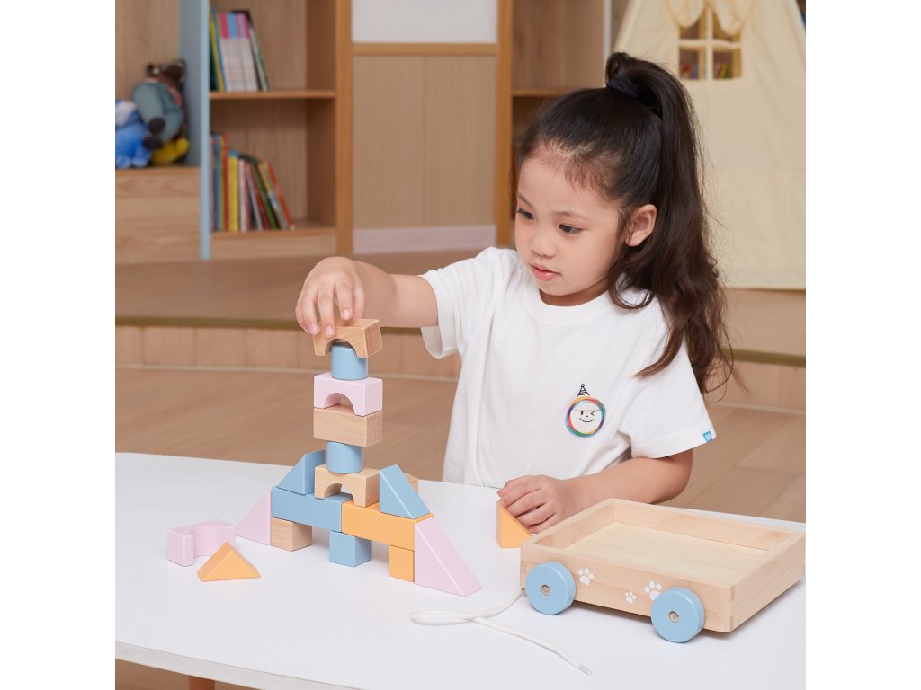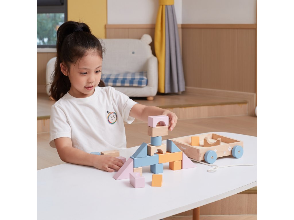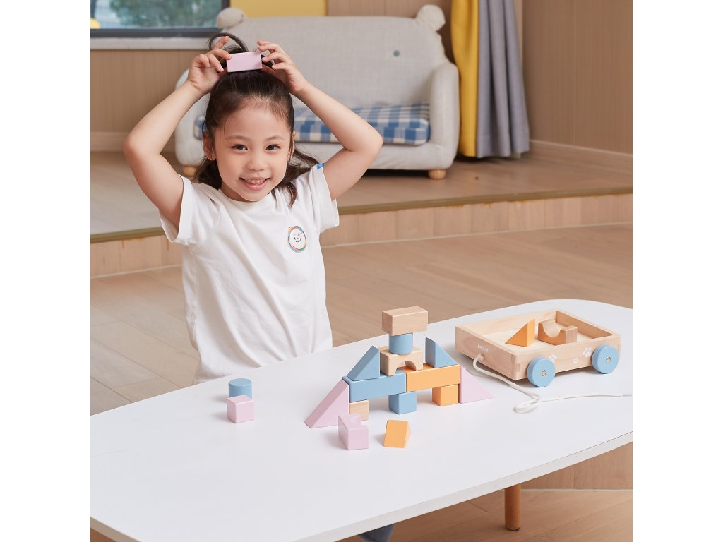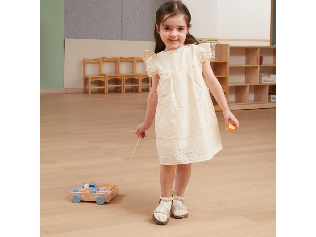 Drevený ťahací vozík od značkyVIGA PolarBsú bloky v pastelových farbách, umiestnené na pohodlnom vozíku. S 20 drevenými blokmi môžete vďaka rôznym tvarom, farbám a odtlačkom vytvárať nápadité stavby.Motorické zručnosti a kreativita sú podporené hrou s drevenými konštrukčnými prvkami. Stavby sú vyrobené z bukového dreva, lakované, v harmonických farbách a chránené pred deťmi. Po skončení hry sa dajú kocky roztriediť späť do vozíka a za chvíľu je všetko opäť upratané. Pomocou šnúrky môže dieťa ťahať vozík s roztriedenými kockami po podlahe.