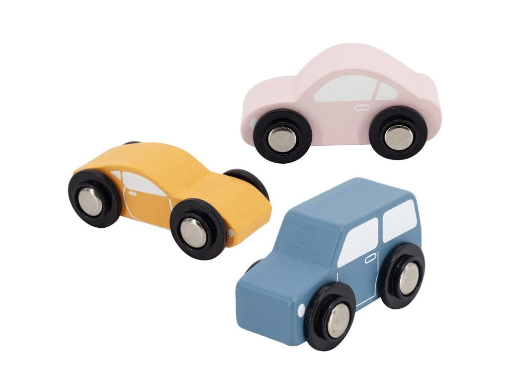 - - 3 farebné drevené autíčka.