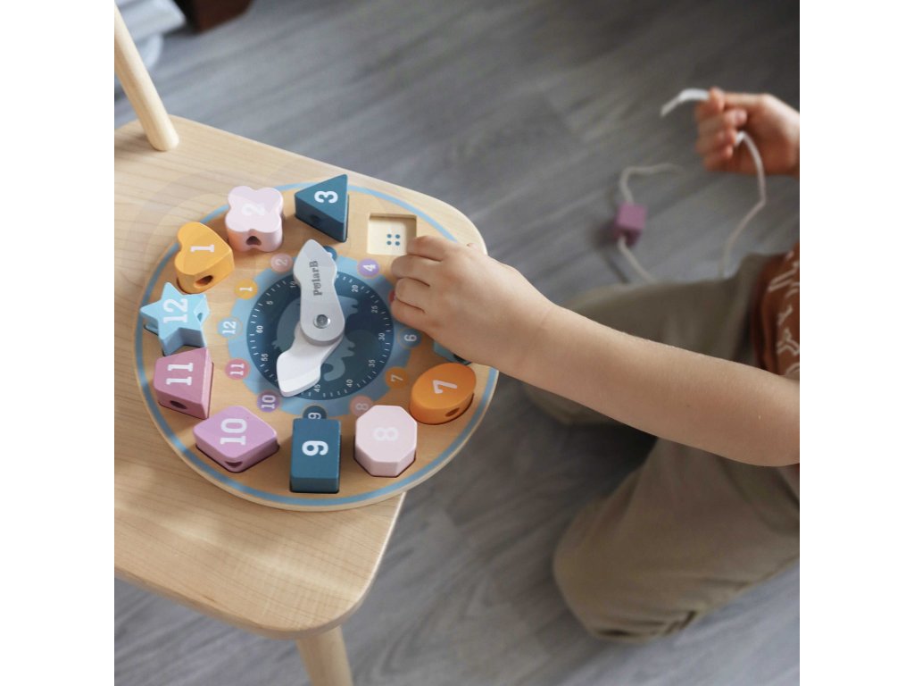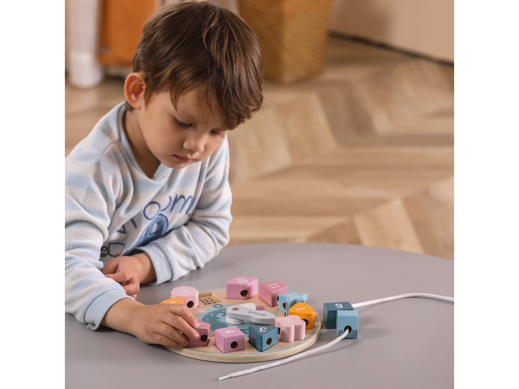 - - hračka v tvare hodinového ciferníka má 2 pohyblivé ručičky, 12 geometrických blokov a šnúrku,