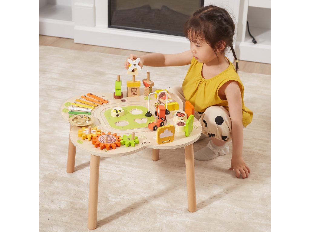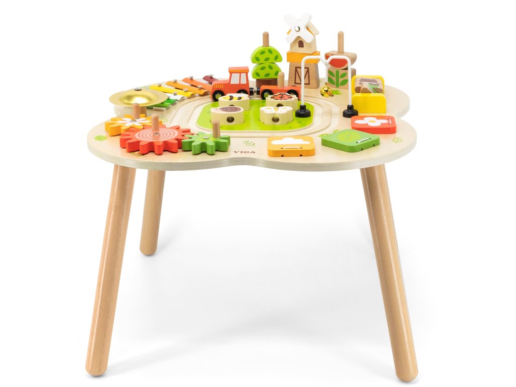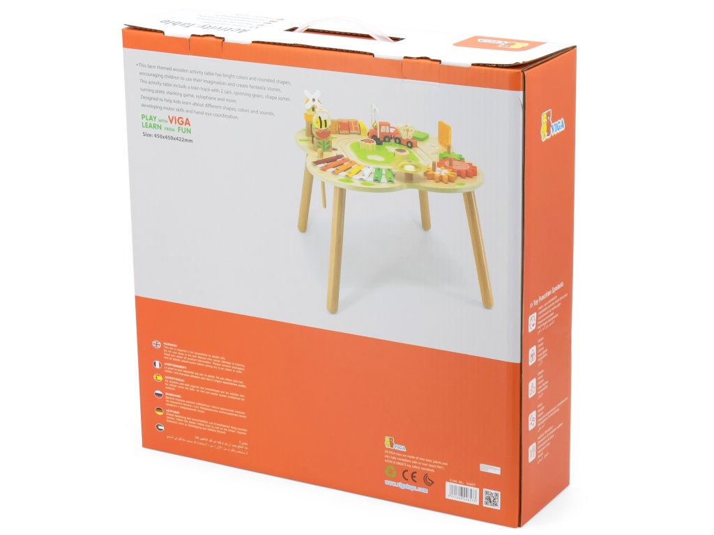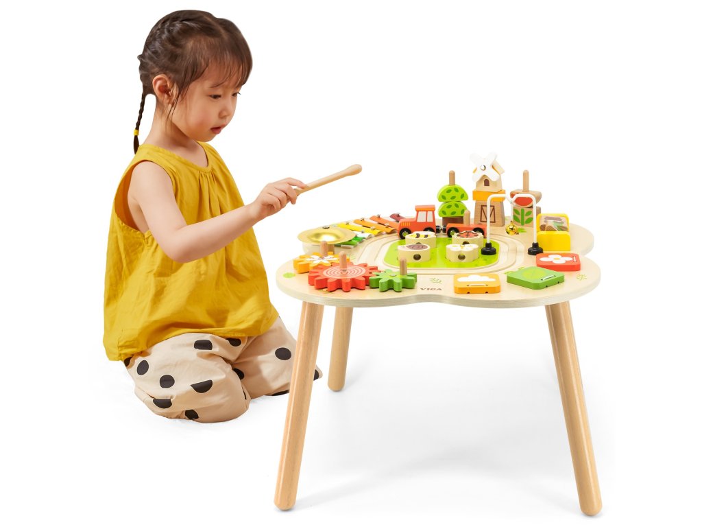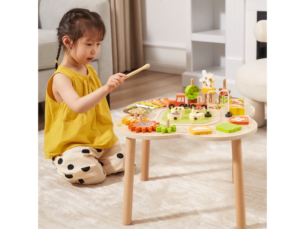 Drevený stôl vzdelávacie od spoločnostiVigaje jednou z popredných hračiek, ktorá dlho vydrží a poskytne vášmu dieťaťu mnoho rokov zaujímavej a kreatívnej hry. Stôl je dostatočne veľký na to, aby sa s ním mohlo hrať niekoľko detí súčasne. Farebnývzdelávacia tabuľka lahodí oku a podnecuje k hre. Stôl je vybavenýkolieska, činely, zvon, pyramídy, železničná trať askladačky.Celá bola nalakovaná a natretá farbami bezpečnými pre deti v žiarivých farbách, ktoré potešia každého používateľa a poskytnú mu veľa zábavy.