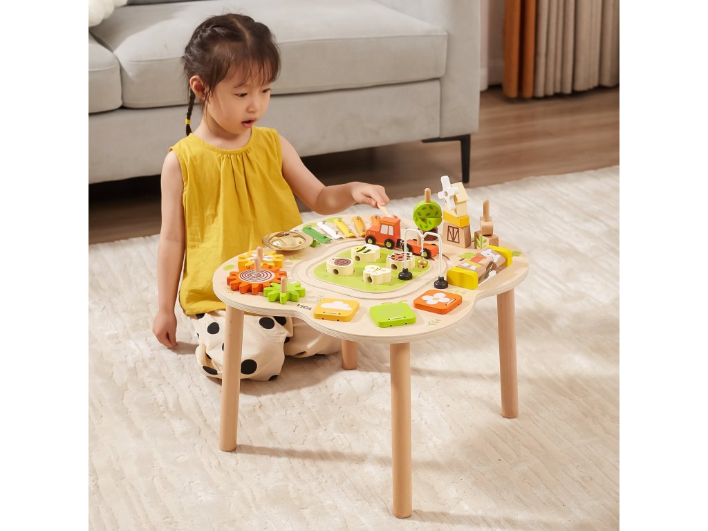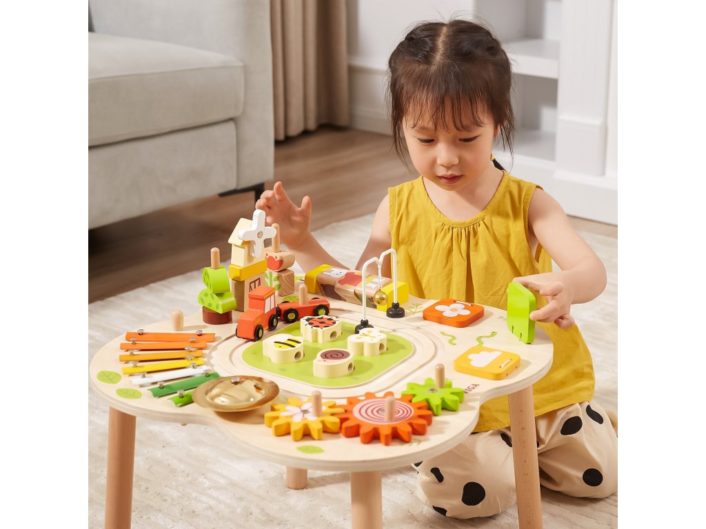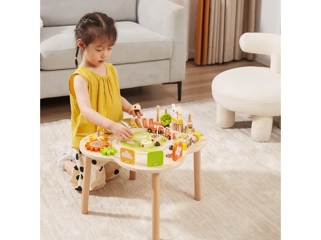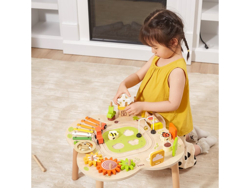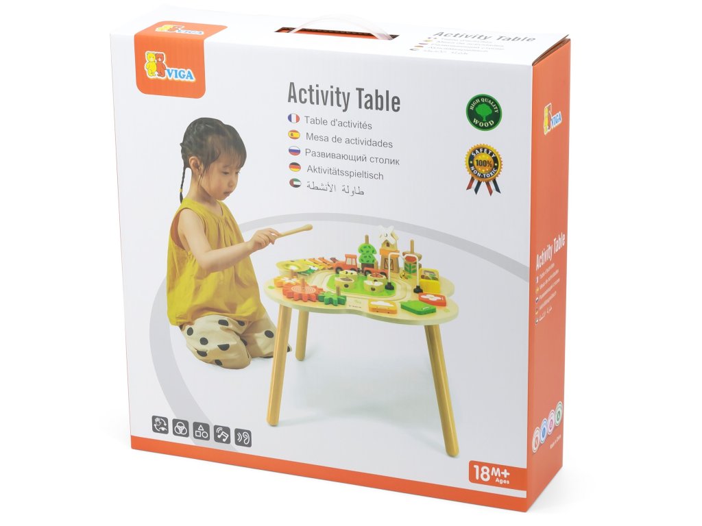 Drevený stôl vzdelávacie od spoločnostiVigaje jednou z popredných hračiek, ktorá dlho vydrží a poskytne vášmu dieťaťu mnoho rokov zaujímavej a kreatívnej hry. Stôl je dostatočne veľký na to, aby sa s ním mohlo hrať niekoľko detí súčasne. Farebnývzdelávacia tabuľka lahodí oku a podnecuje k hre. Stôl je vybavenýkolieska, činely, zvon, pyramídy, železničná trať askladačky.Celá bola nalakovaná a natretá farbami bezpečnými pre deti v žiarivých farbách, ktoré potešia každého používateľa a poskytnú mu veľa zábavy.