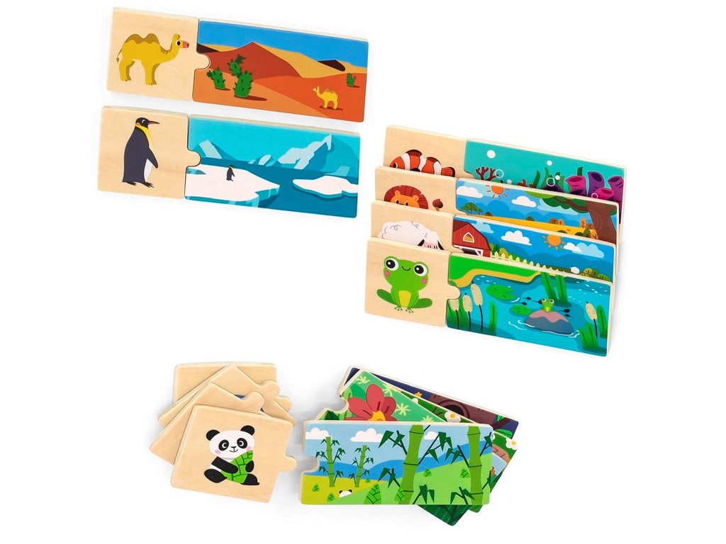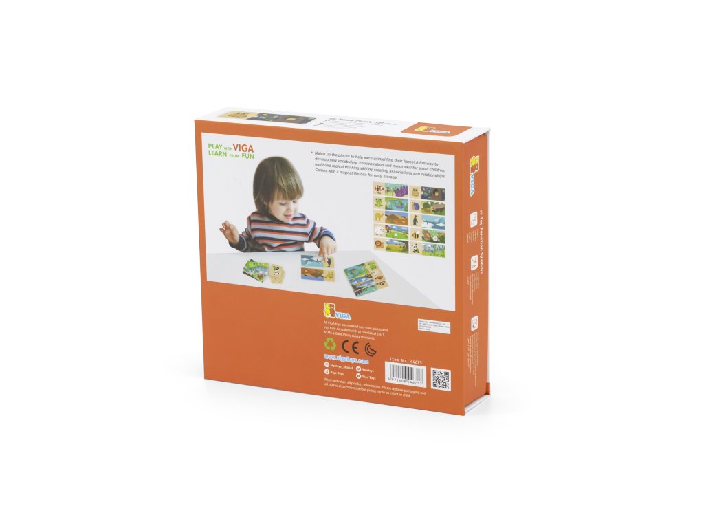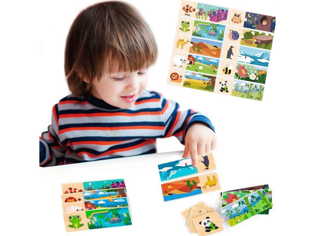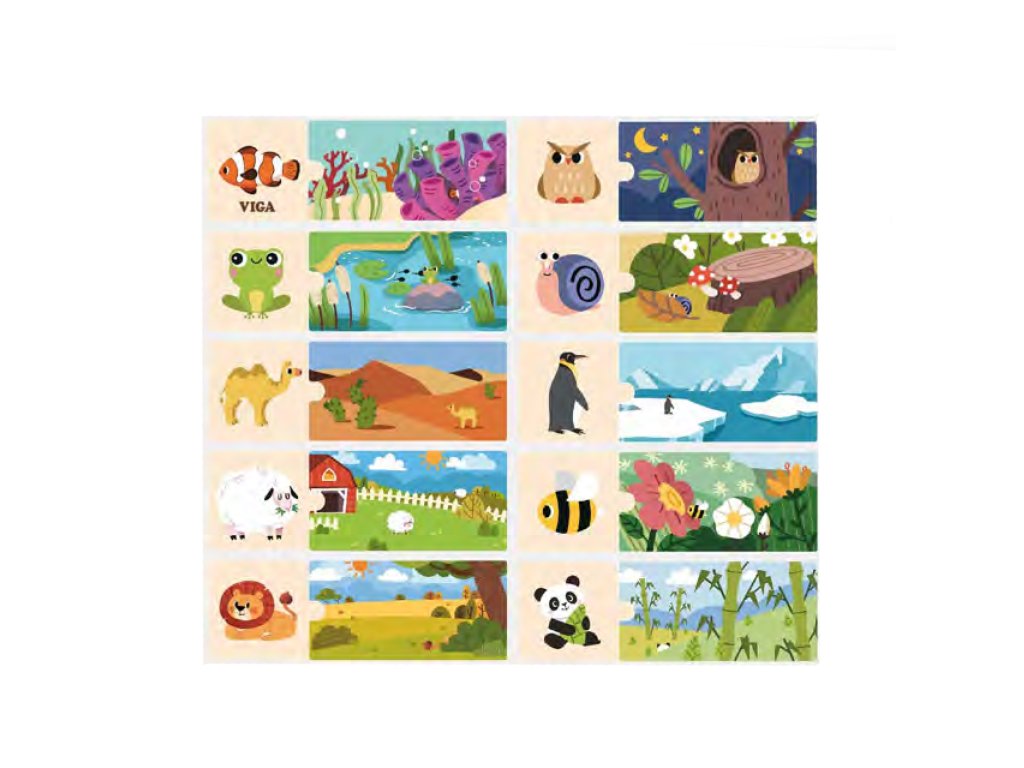Logickéskladačky od značky VIGA - hra jekombinácia hádaniek ktoré sa navzájom zhodujú. Súbor sa skladá z20 prvkovprvky musia byť skombinované tak, aby sa zviera zaradilo do svojho prirodzeného prostredia. Prvky súveľmi dobre vybavenéa majúfarebné obrázky.