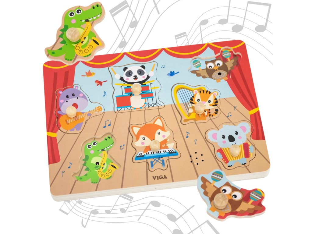 VIGA Puzzle Zvuk zodpovedajúci hudobným zvieratám je nádherná skladačka, ktorá dieťa zoznámi so svetom hudby a zvukmi nástrojov. Táto vzdelávacia hračka rozvíja manuálne a kognitívne zručnosti a podporuje interaktívnu hru. Po zdvihnutí a opätovnom poskladaní dielika dieťa počuje realistický zvuk nástroja, čo posilňuje zážitkové učenie.