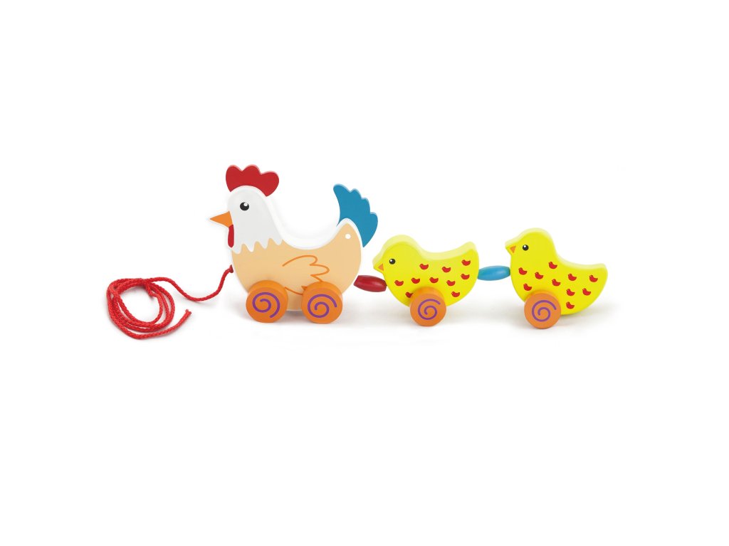 Sliepka a jej dve mláďatá sú navzájom spojené červenou šnúrkou. Medzi vtáčikmi sú umiestnené farebné korálky. Po zatiahnutí sa celý zväzok hravo pohne.
