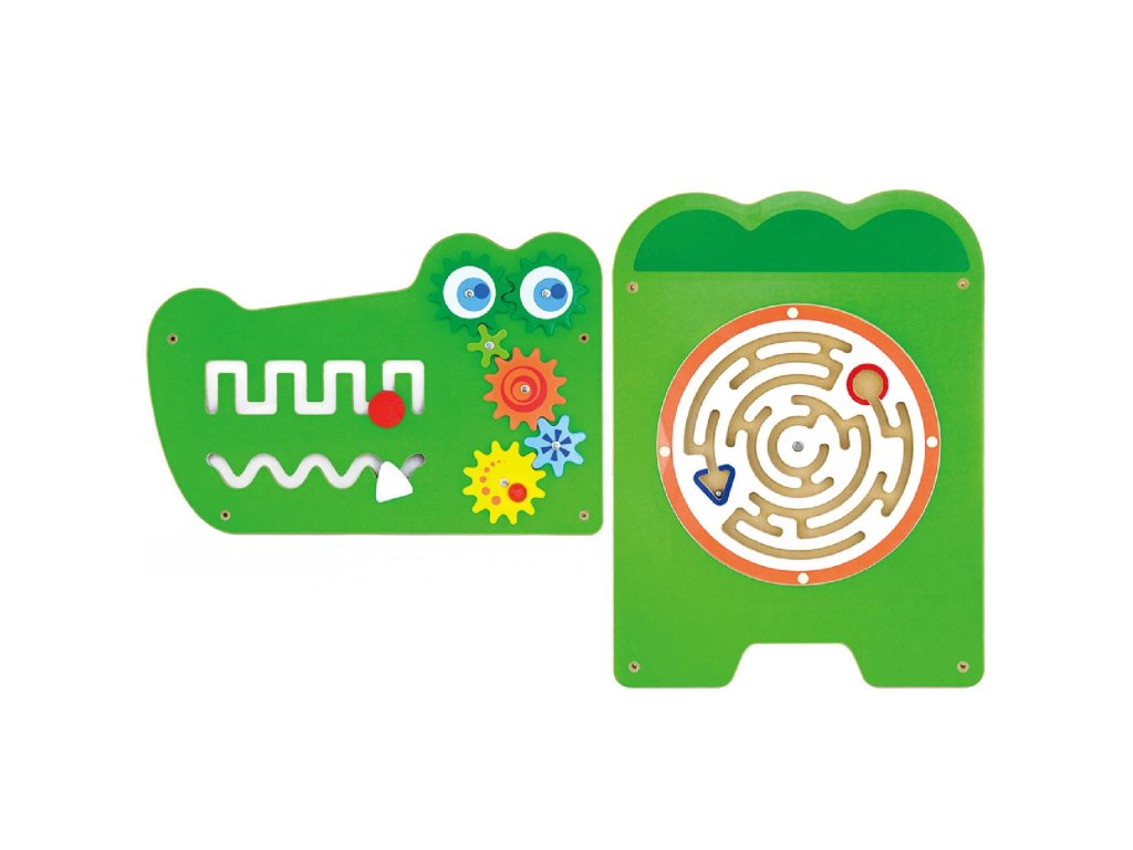 Prvým prvkom je krokodília hlava. Tu batoľa nájde labyrinty, cez ktoré môže viesť umiestnené prvky, pričom si precvičuje pohyblivosť rúk a prstov. Okrem toho tu nájde ozubené kolieska, ktoré dajú do pohybu oči nášho krokodíla! Kolieska možno ľubovoľne prestavovať a hľadať nové možnosti umiestnenia.