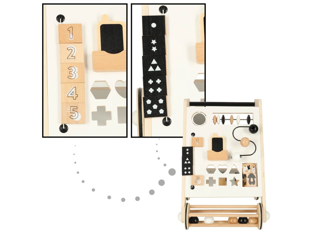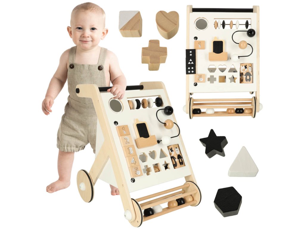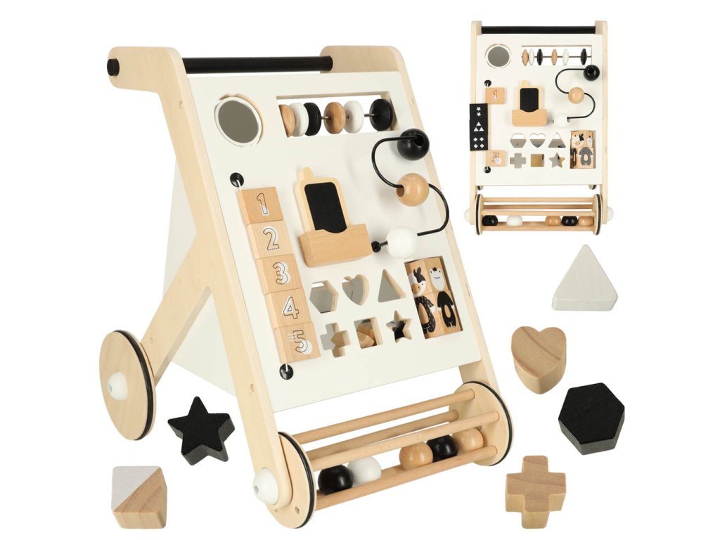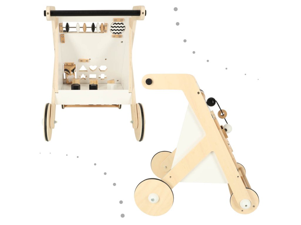 Drevený kočík má zabudované vzdelávacie hračky, ktoré vášmu dieťaťu umožnia zabaviť sa aj vtedy, keď sa mu nechce robiť ďalšie náročné kroky! Vďaka tomu sa kočík stane obľúbenou hračkou vášho dieťatka! Vaše dieťatko si užije veľa zábavy a vy budete mať istotu, že zábava je spojená so starostlivosťou o rozvoj vášho dieťaťa.