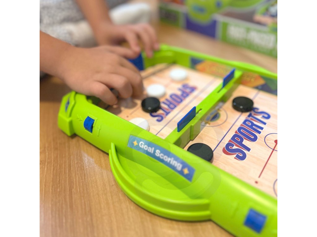 Väčšinajedinečná rodinná hra pre všetky vekové kategórie. Podporte rozvoj svojho dieťaťa a spoločne sa zabavte! Hráči primerane natiahnu gumičku,vystreliť puk tak, aby sa dostal do poľa s najväčším počtom bodov. Účastníci majú na to 3 pokusy - toľko pukov dostane každý účastník. Osoba snajvyšší počet bodov vyhráva! Okrempriaznivý vplyv na koncentráciu dieťaťa a tiež upevňujematematické operáciesčítaním postupných bodov získaných v hre.