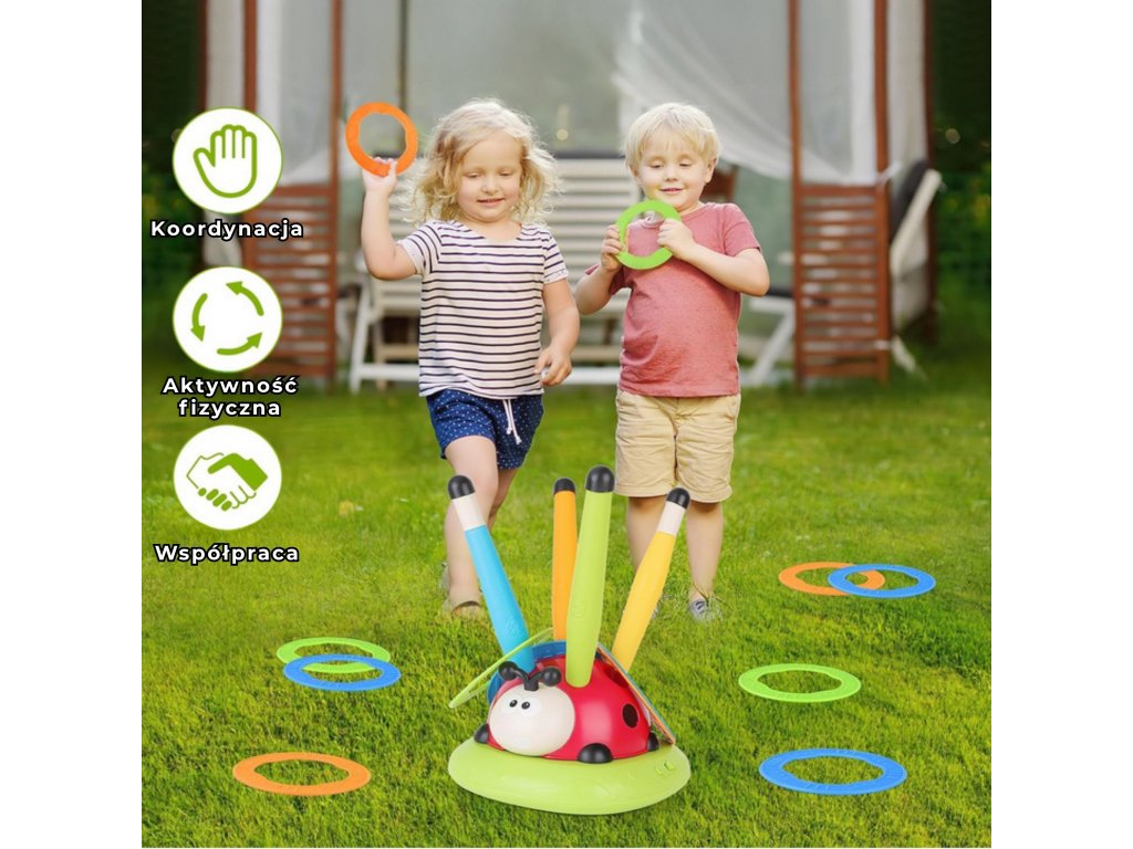 - - Hra ringo obsahuje12 farebných obručíktoré musia deti hodiť na cieľ - točiacu sa berušku. Je to výborná aktivita na rozvoj reflexov, presnosti a koncentrácie.