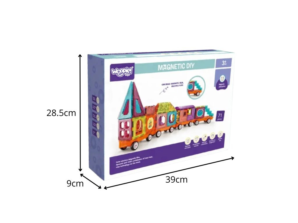 Postavte si vlastný farebný vlak! Tento71-prvok nastaviťmagnetické tehly od značkyWoopie je ideálnou hračkou na vytváranie rôznych vozidiel. Kocky sa spájajú jednoduchým a čarovným spôsobom vďakazabudované magnety. Umožňujú vám voľne vytvárať vlak s vagónmi alebo inými konštrukciami a zároveň rozvíjaťpriestorová predstavivosť imanuálne zručnosti. Je to ideálny úvod do učenia sa s konceptomSTEAMspojenie vedy a tvorivosti.