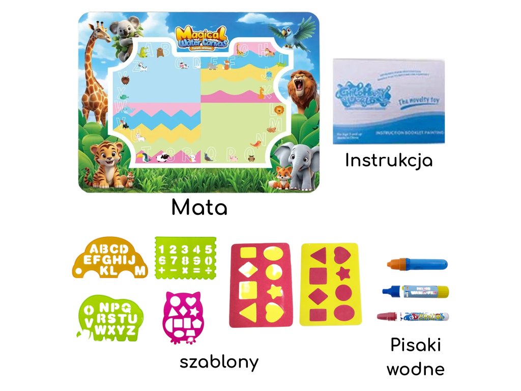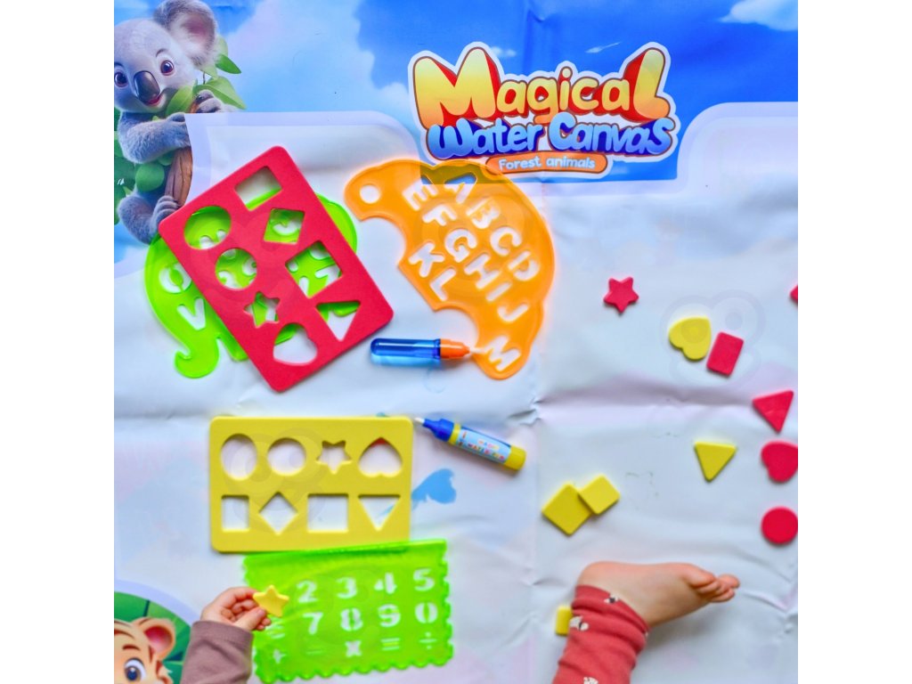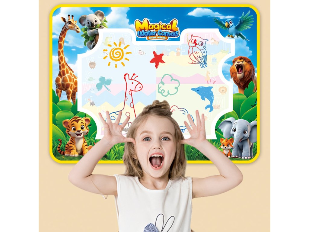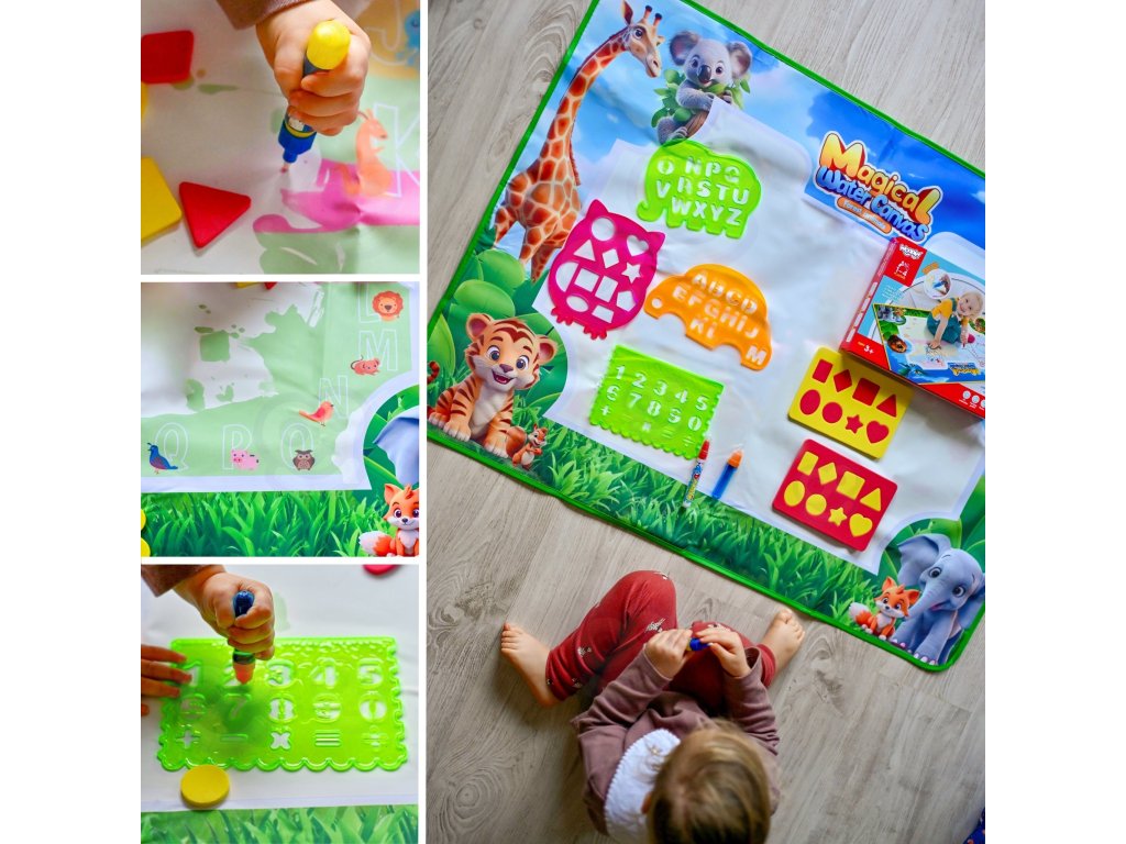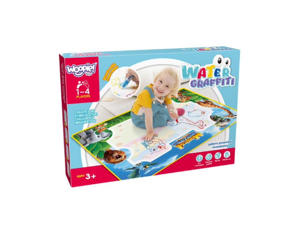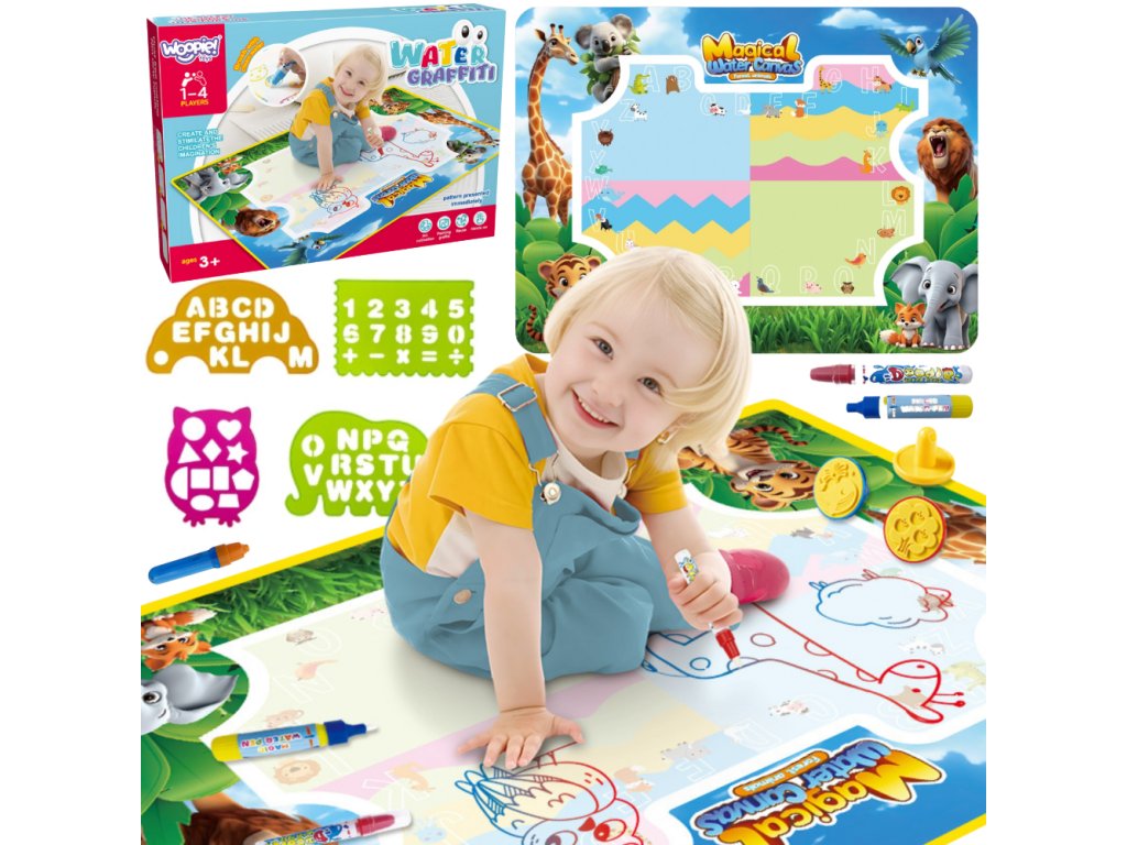 Značka Water Painting MatWOOPIE je vzdelávacia výtvarná súprava pre deti od3 roky. Jednoducho naplňte priložené fixky čistou vodou a objavujte farby, písmená, čísla a tvary bez atramentu alebo farby. Kresby sa na chvíľu objavia a po zaschnutí zmiznú a pozývajú vás k ďalšej hre. Veľký formát 100 × 75 (cm) poskytuje priestor na spoločné tvorenie, zatiaľ čo veselá grafika zvierat džungle podporuje učenie hrou.
