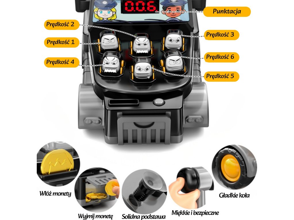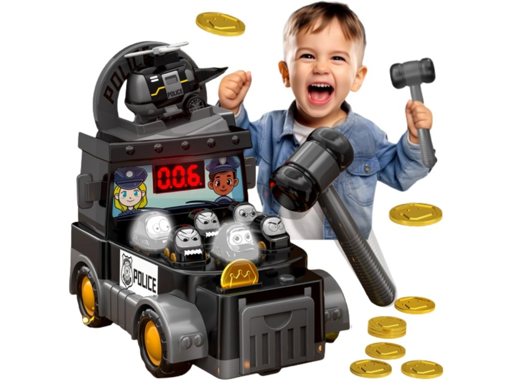 Hra zručností"Zasiahnuť krtka" od značkyWoopie! je vzrušujúca hra kombinujúca klasický mechanizmuskladivo s policajným motívom. Dieťapoužíva kladivo na"zatknutie"vyskakovanie "zločincov" z policajného vozidla. Súprava nabáda súťaž irýchlereakcie, zatiaľ čo motív policajného auta dodáva dynamický nádych. Výroba z bezpečných materiálov a farebná schéma v súlade s policajným motívom zvýrazňujúatraktívnosť. Ide o ideálnu hračku, ktorá učí reflexy a koordináciuinteraktívna zábava.