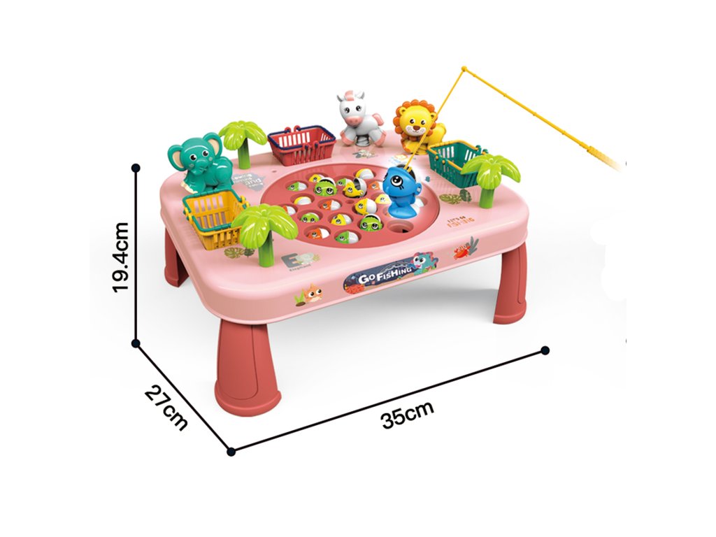 Tento nezvyčajný stôl je bránou k nekonečnej zábavepre celú rodinu a priateľov.Je vyrobený z robustného materiálu a je nielenrobustnýale ajestetické. Jeho farebný dizajn priťahuje pozornosť a podnecuje k spoločnej hre. Koše umiestnené po stranách stola sú nielen praktickým doplnkom, ale aj prvkom súťaže. Nazbierajte čo najviac rýb,dajte ich do košov a pripravte sa na to, že na konci hry budete počítať body. Po stranách stola sú tiež roztomilé zvieratká, ktoré sú príjemné na pohľad. Aby bol rybolov ťažší,hracia plocha, na ktorej sú umiestnené ryby, sa pohybuje. Aby bolo hranie príjemnejšie, stolík vydáva melódiu a zvukové efekty!
