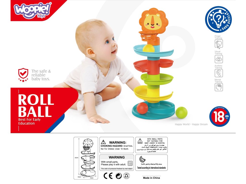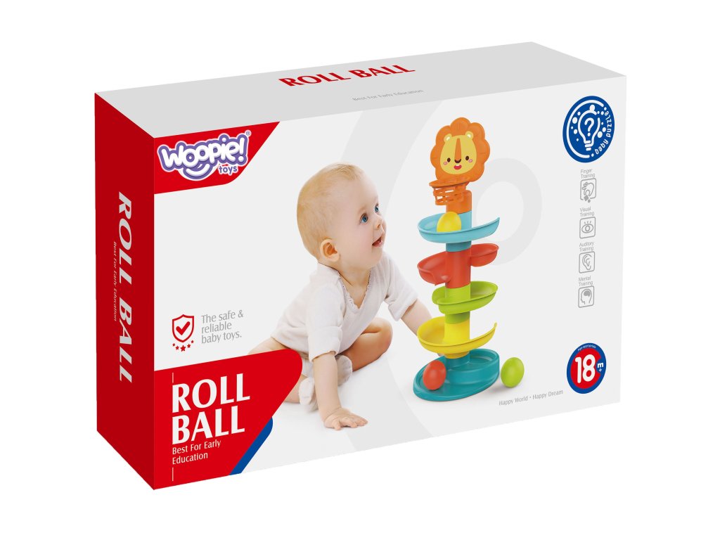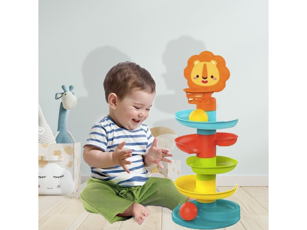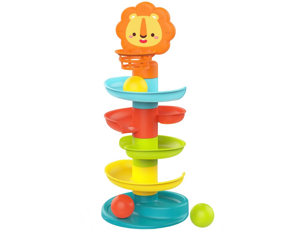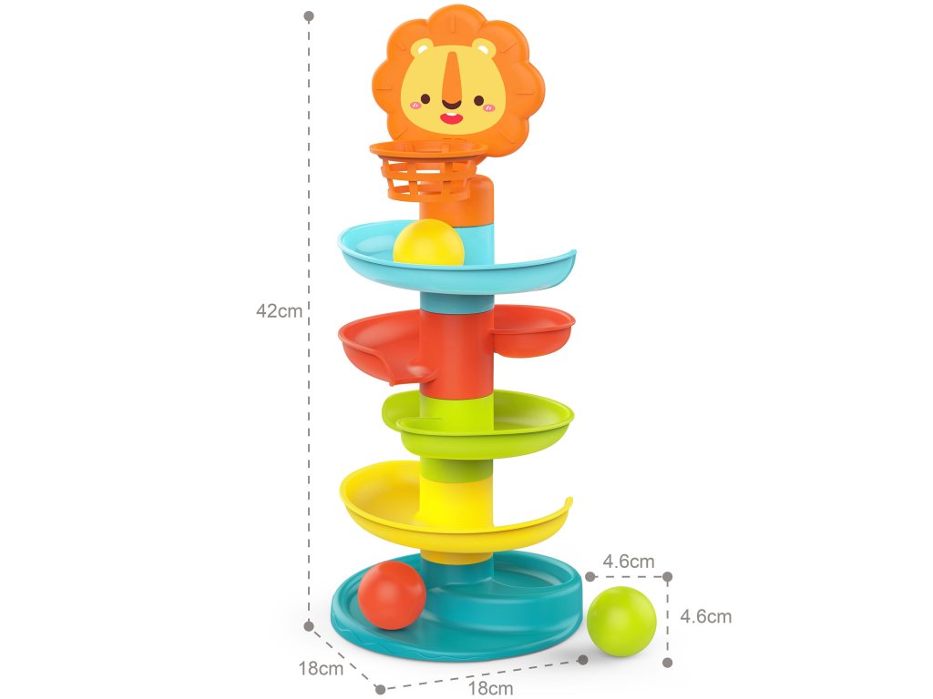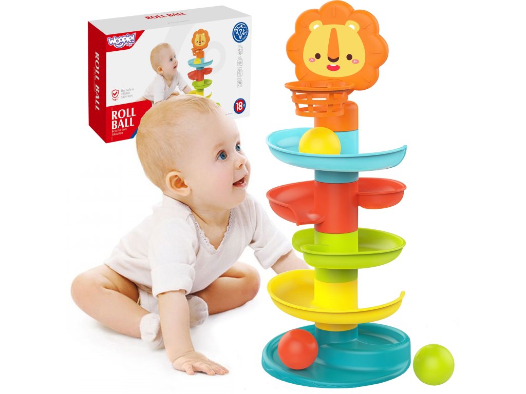 Posuvná guľôčková dráha piatich úrovní s košom, ktorý zostal po značkeWOOPIE je ideálnym darčekom pre vaše dieťa! Počas hry batoľanaučí sa, ako tvary fungujú gule na šikmých plochách. Vo vnútri guľôčok sa nachádzajú malé prvky, ktorévydávať zvuky počas valcovania, čím sa zabezpečíďalšie zmyslové vnemy. Sklíčko mápäť farebných úrovníktoré musí loptička umiestnená dieťaťom prekonať. V hornej časti sa nachádza priateľský lev s košom, ktorý sa dieťa pokúsi trafiť, čím sa rozvíja jehomanuálna zručnosť, koordinácia a presnosť. Hračka je vyrobená zbezpečný a schválený plast. Skvelý spôsob, ako sa učiť hrou!