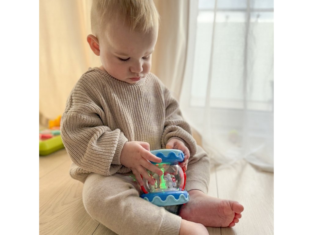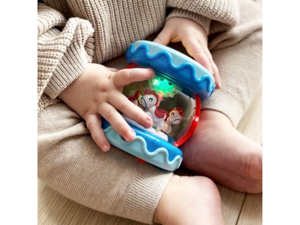 Objavte magický svet hudby a svetla sHudobný bubon Pozitívny 3v1 od značkyWOOPIE BABY. Táto interaktívna hračka kombinuje tri funkcie:bubon,hudobné skrinky ahviezdny projektor. Je to ideálna pomôcka na spanie, ktorá je tiež veľmirozvíja zmysly dieťa. Bubon má6 zvukových tlačidielktoré okrem iného hrajú perkusívne melódie a zvuky zvierat. V režime hudobnej skrinkykone sa otáčajú vnútri a v noci hračka funguje akoprojektornapodobňovaním žiarivých hviezd. Okrem toho vďaka svojmu valcovitému tvaru nabáda batoľa, abyučenie sa plaziť. Má pohotovostný režim, ktorý po 60 sekundách nepoužívania vypne zvuky, čím šetrí batériu.