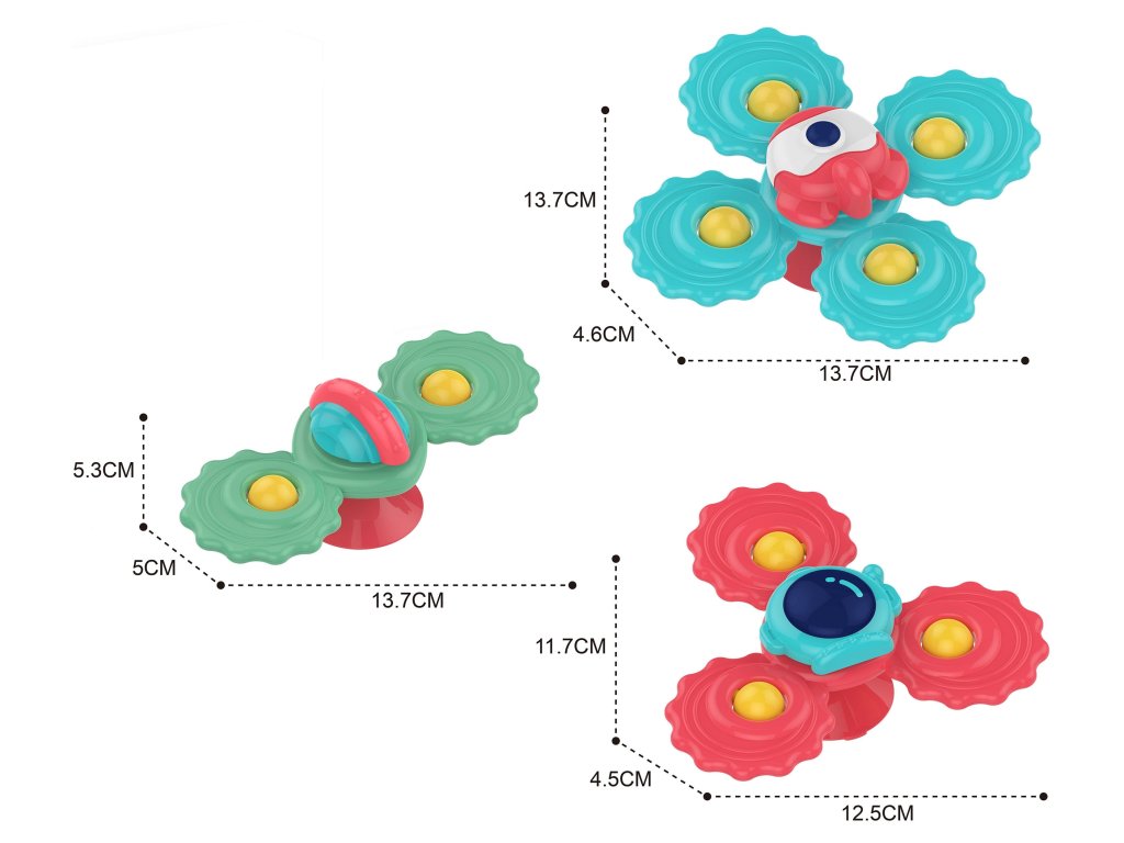 Súprava3 rotujúce hračky typspinner z adresyWOOPIE je interaktívna a farebná hračka pre vaše dieťa. Každá hračka je iná a má zodpovedajúcu2, 3 alebo 4 ramená. Dajú sa pripevniť na hladké povrchy, čo zvyšuje zábavu. Vyrobené zbezpečné materiálymôže vykonávaťfunkcia prerezávania zubov pre vaše dieťa. Vďaka rôznym hrbolčekom a priehlbinám je dokonalestimulovať zmysly a zručnostimotorické zručnosti detí.