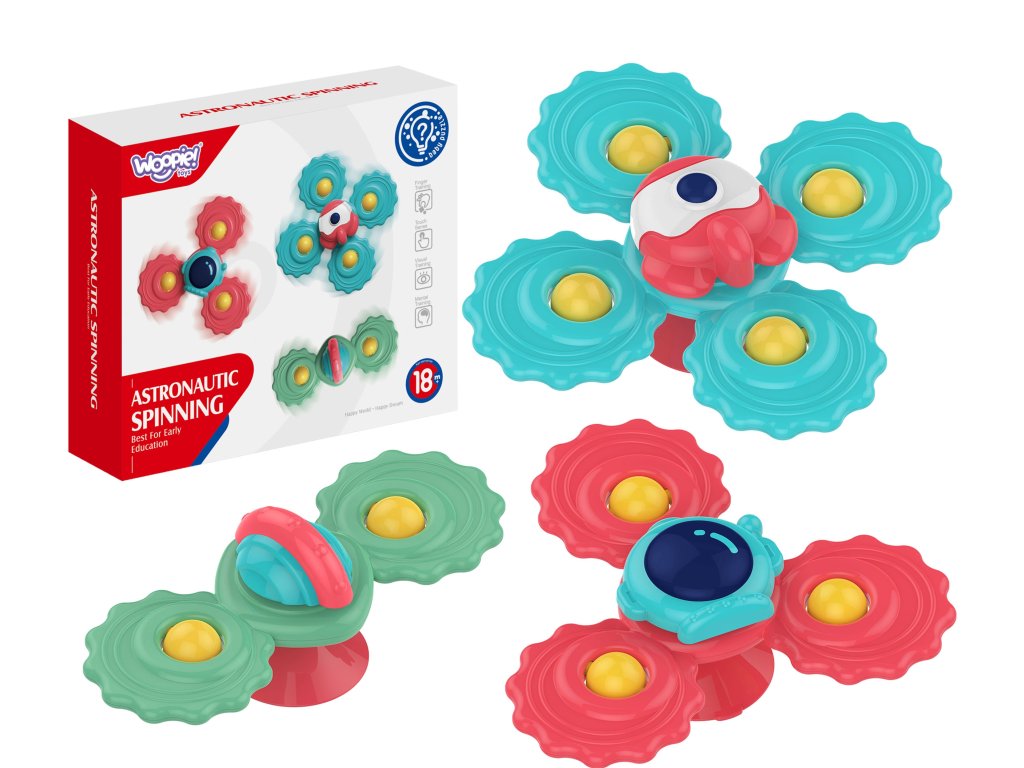 Súprava3 rotujúce hračky typspinner z adresyWOOPIE je interaktívna a farebná hračka pre vaše dieťa. Každá hračka je iná a má zodpovedajúcu2, 3 alebo 4 ramená. Dajú sa pripevniť na hladké povrchy, čo zvyšuje zábavu. Vyrobené zbezpečné materiálymôže vykonávaťfunkcia prerezávania zubov pre vaše dieťa. Vďaka rôznym hrbolčekom a priehlbinám je dokonalestimulovať zmysly a zručnostimotorické zručnosti detí.