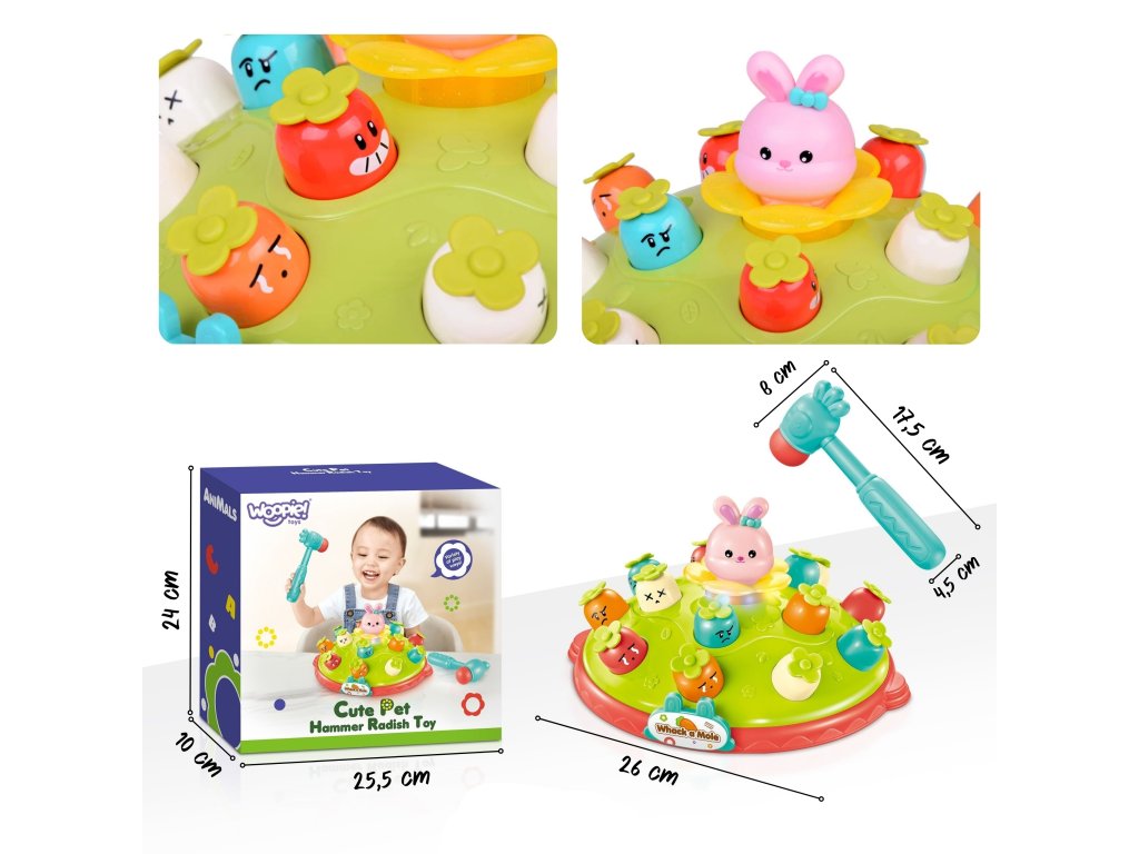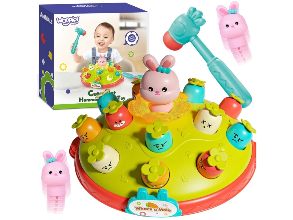 Zoznámte sa s hračkou, ktorá vám poskytne hodiny fantastickej zábavy a pomôže rozvoju vášho dieťaťa. Táto stránkainteraktívna hra hit the mole od značkyWoopie je moderný prístup ku klasickej zábave, ktorý zapojí batoľa do dynamickej súťaže. Vďakaveselé zvuky hra sa stáva ešte pútavejšou. Je to ideálny spôsob, ako si precvičiťreflexy a koordináciaa zároveň chutná zábava, ktorá podnecuje kreativitu a predstavivosť. V tejto zábavnej hre je vašou úlohouudrieť kladivom do náhodne vybranej mrkvy. Zasiahol si - a zrazu z kvetumalý zajačik bude strieľaťskáče vzduchom ako z praku! Hračka bola navrhnutá s ohľadom na bezpečnosť a vývoj dieťaťa.Hladké okraje isolídne spracovanie aby bola plnebezpečnéa mäkké kladivká chránia malé ručičky. Je to fantastický darček, ktorý zábavnou formou rozvíja kľúčové zručnosti!