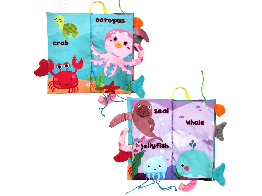 Brožúra s chvostmi morských živočíchov od značkyWoopie ideálne pre najmenšie deti.Šuchotanie i veľmi mäkké hmatové stránky rozvíjajú zmysly dieťaťa tým, že pôsobia akozmyslová funkcia.Farebné ilustrácie trénovať zrak a vnímavosť. Chvosty rôznych zvierat trčia na každej strane; ich chytaním si batoľa precvičujekoordinácia oko-ruka. Brožúra sa môže použiť akozáves na detský kočík alebo postieľkuzapínanie na suchý zips.