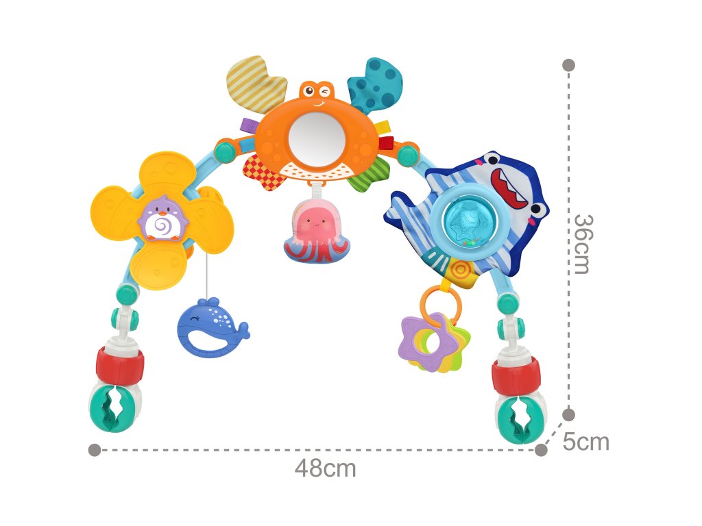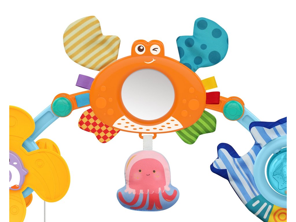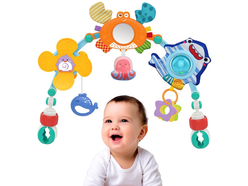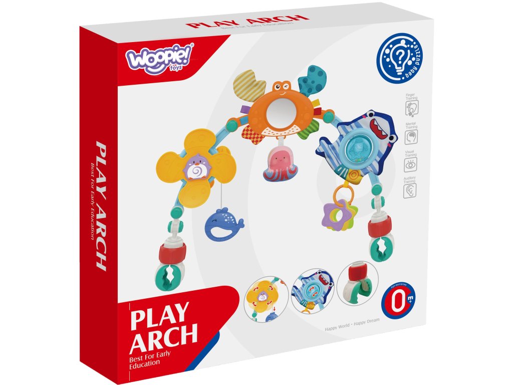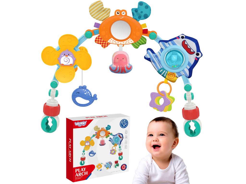 Hračka oblúková tyč od značkyWOOPIE je univerzálna hračka, ktorá dodá šarm a zábavu každému kočíku, autosedačke alebo postieľke. Je mimoriadneflexibilnéaby sa dal ľahkopripevniť prakticky kdekoľvek. Na stúpačke sú rôzne morské hračky:prívesok tučniaka, zrkadlového kraba, chobotnice, žraloka s chrastítkom a delfínaktoré reagujú na interakciu dieťaťa a závesy na hryzátka v tvare hviezd. Každá z týchto hračiek má inú štruktúru a spôsob pôsobenia, ktoréstimuluje zmysel pre dotyk dieťaťa a pomáha rozvíjať jehomotorické zručnosti.
