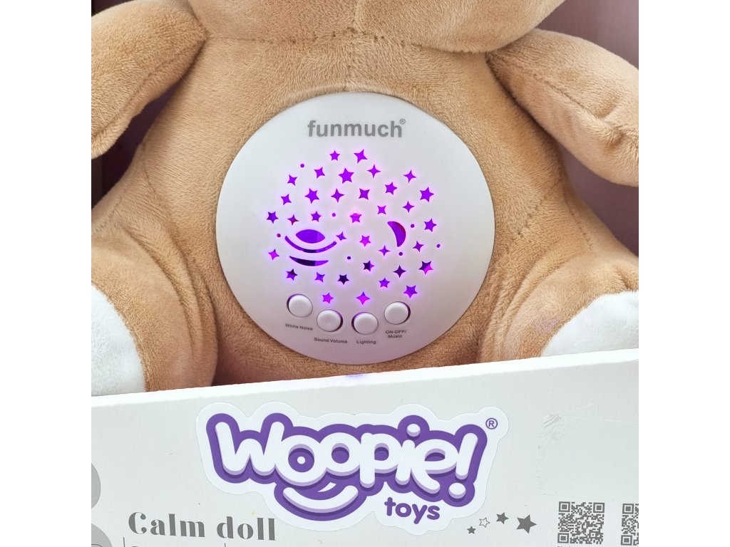 Plyšový medvedík na spanie od značky Woopiebude krásnym spoločníkom na spanie Vaše dieťatko. Maskot je dokonalýpre dojčatá iseniori detiktorí neradi zaspávajú sami. Medvedík bude dokonalým priateľom pre dobré sny a záchrancom pred príšerami v skrini.Objatiemá4 funkcie. Keď ho zapnete, budete počuť melódie a bruško začne žiariť rôznymi farbami. Keď stlačíte tlačidlo "Biely nos", budete počuť rôznehluk alebotlkot srdca. Hračka má tiež až10 rôznych uspávaniek a možnosť nastavenia3 úrovne hlasitostiaby ste mohli nastaviť zvuk podľa želania vášho dieťatka a mali istotu, že sa počas spánku nezobudí.Hračka je vhodná pre dojčatá, a preto jenaplnené mäkkou vatou.Okrem toho je možné plyš bezpečne aľahko čisté, vyňatím mechanizmus a jeho následnú jednoduchú montáž. To umožní aj staršiemu dieťaťu používať hračku ako maskota bez mechanizmu. Každé dieťa si ju zamilujemedvedík!