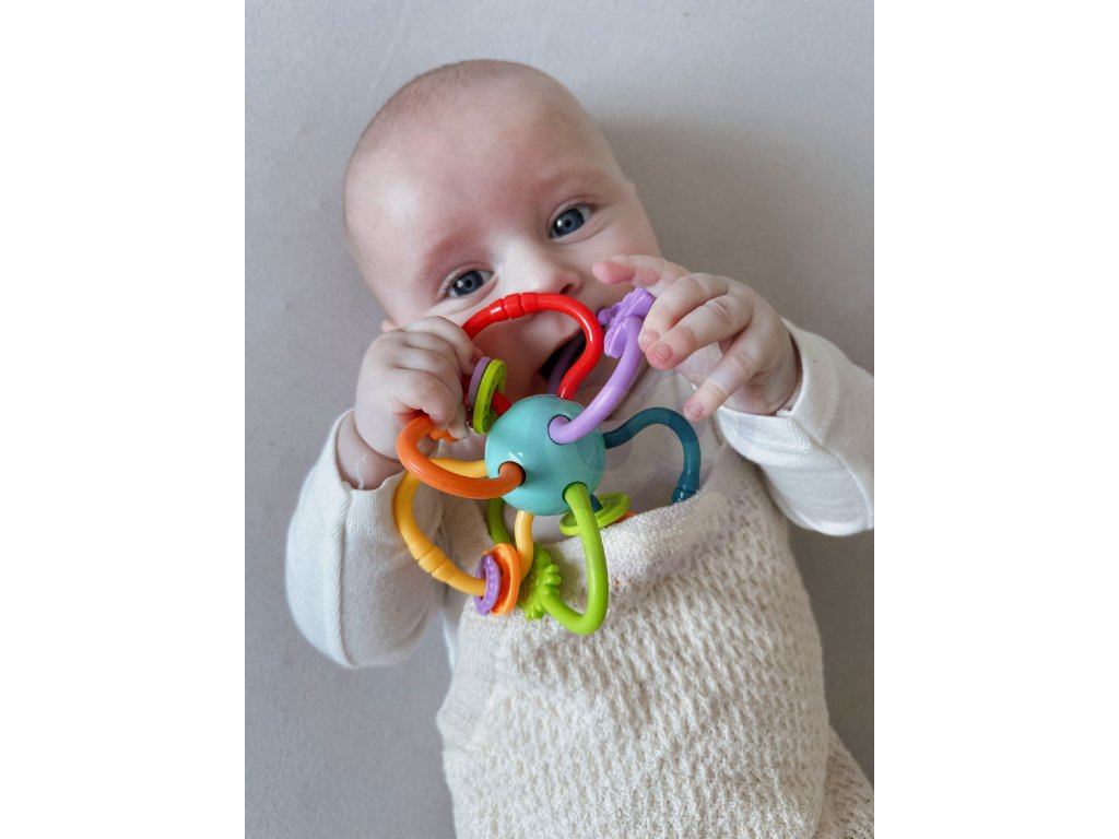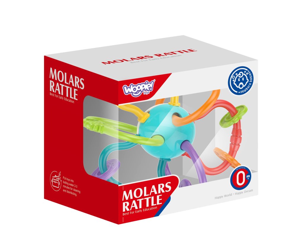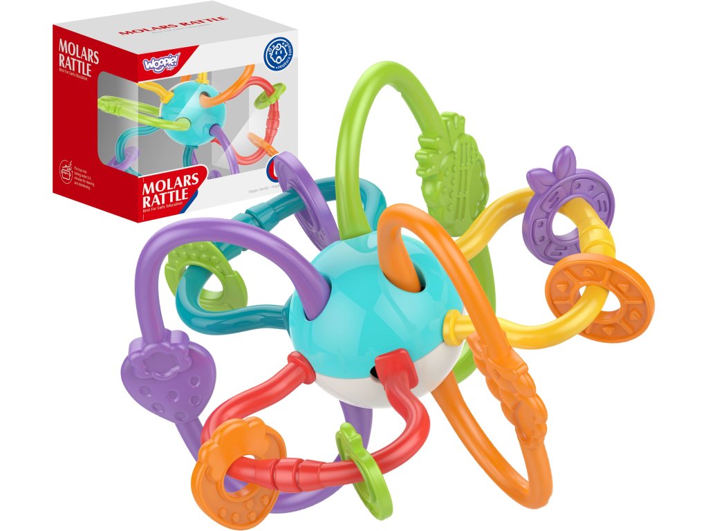 Senzorická hračka od značkyWoopie je ideálny pre dieťa, ktorému sa prerezávajú zúbky. Skladá sa z mäkkých, nádherne farebných rúrok, ktoré upútajú pozornosť dieťaťa. Vďaka ľahkému dizajnu ju batoľa ľahko drží v ruke. Bola skonštruovaná v bezpečné pre dieťa bez ostrých hrán a má mäkké časti, ktoré sa môžu používať ako uhryznutie. Hrou s ním ovplyvňuje rozvoj zmyslov hmatu, zraku a sluchu. Obsahuje hrkálkaktoré môžu upútať pozornosť. Na flexibilných obaloch sa môže presúvať umiestnené farebné prvky. Hračku možno uložiť do chladničky, aby lepšie uľavila boľavým ďasnám dieťaťa pri prerezávaní zúbkov.