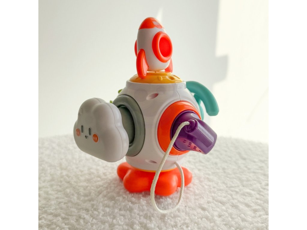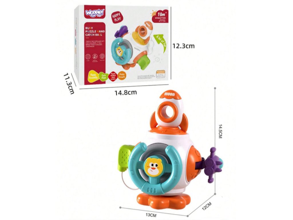 Montessori vesmírna raketa Ball od značkyWOOPIE je farebná, vzdelávacia senzorická kocka pre detiod 18 mesiacov veku. Obsahuješesť panelov s aktivitamiktoré stimulovať zmysly dieťaťa a rozvíjať jeho motorické schopnosti. Prvky ako naprvolant, tlačidlo mraku, analógová zástrčka, hračky s rotačným mechanizmom, hračky s raketami a vesmírnymi loďami poskytnúť rôzne zážitky. Hračka je bezpečná, vyrobená z kvalitných materiálov a navrhnutá s ohľadom na vývoj a bezpečnosť dieťaťa.