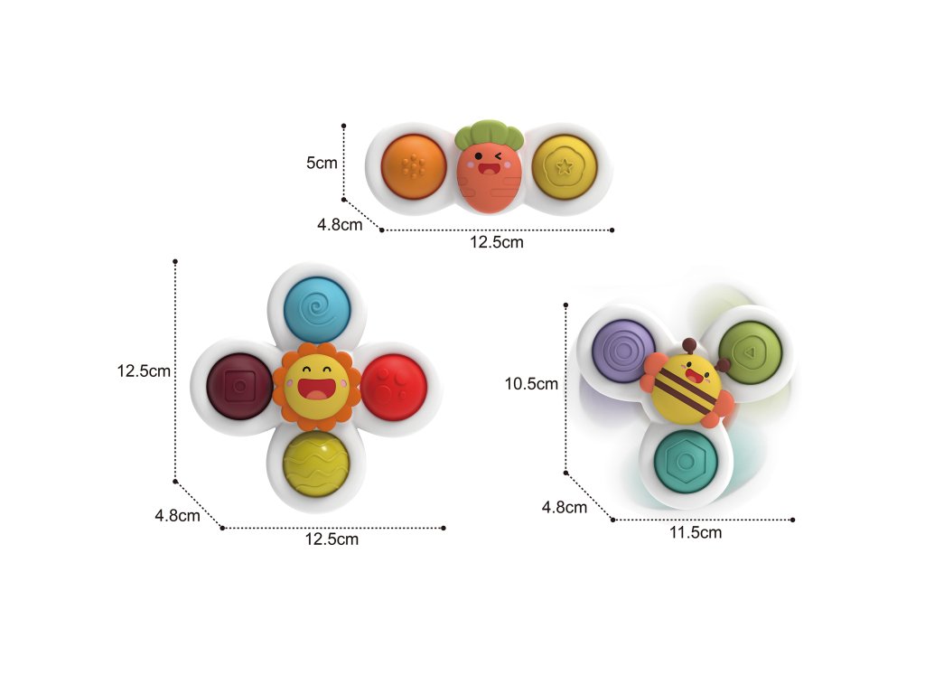 Rozmery výrobku: | mrkvový spinner 12 x 5 (cm) / včelí spinner 11 x 10 (cm) / slnečný spinner 10 x 10 (cm) |