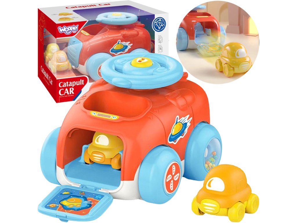 Spúšťacie vozidlo v značkáchWOOPIE je skvelý nápad pre deti. Vnútriautá máme2 menšie kolesové vozidlá. Kompletný súborpriložené je odpaľovacie zariadenie čo vám umožní urobiť zábavu ešte zaujímavejšou. Umiestnite auto do katapultu, otočte volantom a stlačte klaksón a vaše auto vyskočí z vozidla! Autíčko je tiež vybavenézmyslové prvky napríklad zvuky kolies pri otáčaní. Skvelá možnosť hrať sa s priateľmi alebo sám.