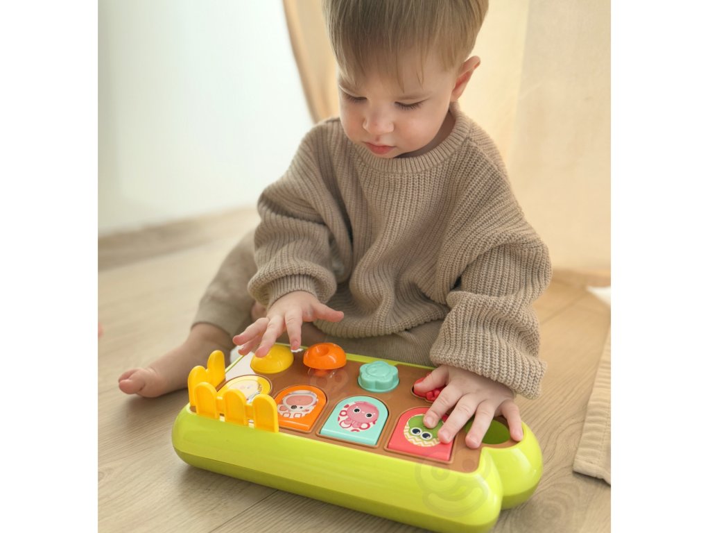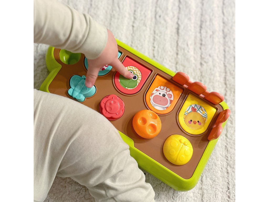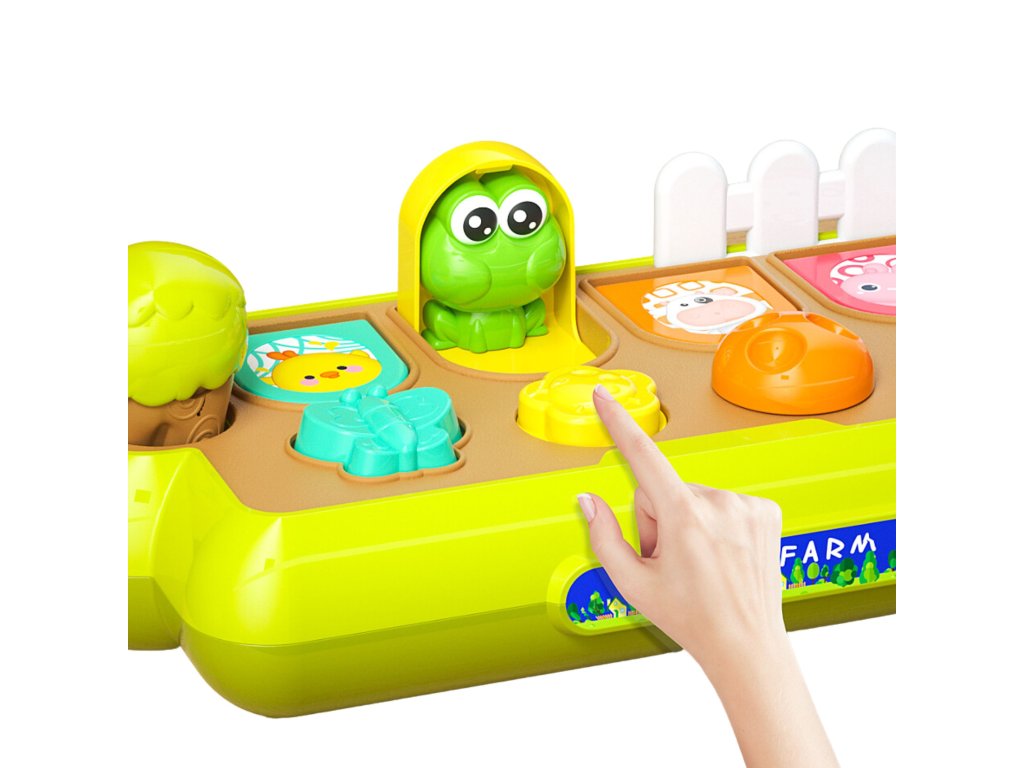 5 zvieracích figúrok sa objaví pomocou príslušných tlačidlo. Dieťa samo objaví príčinnú súvislosť toho, prečo vyskočila určitá postava.