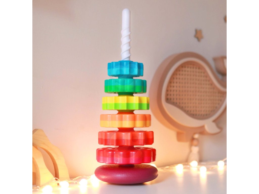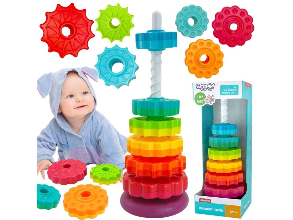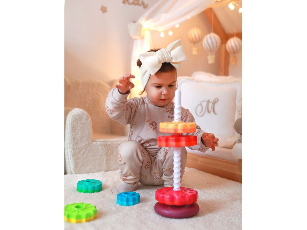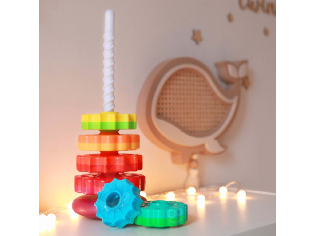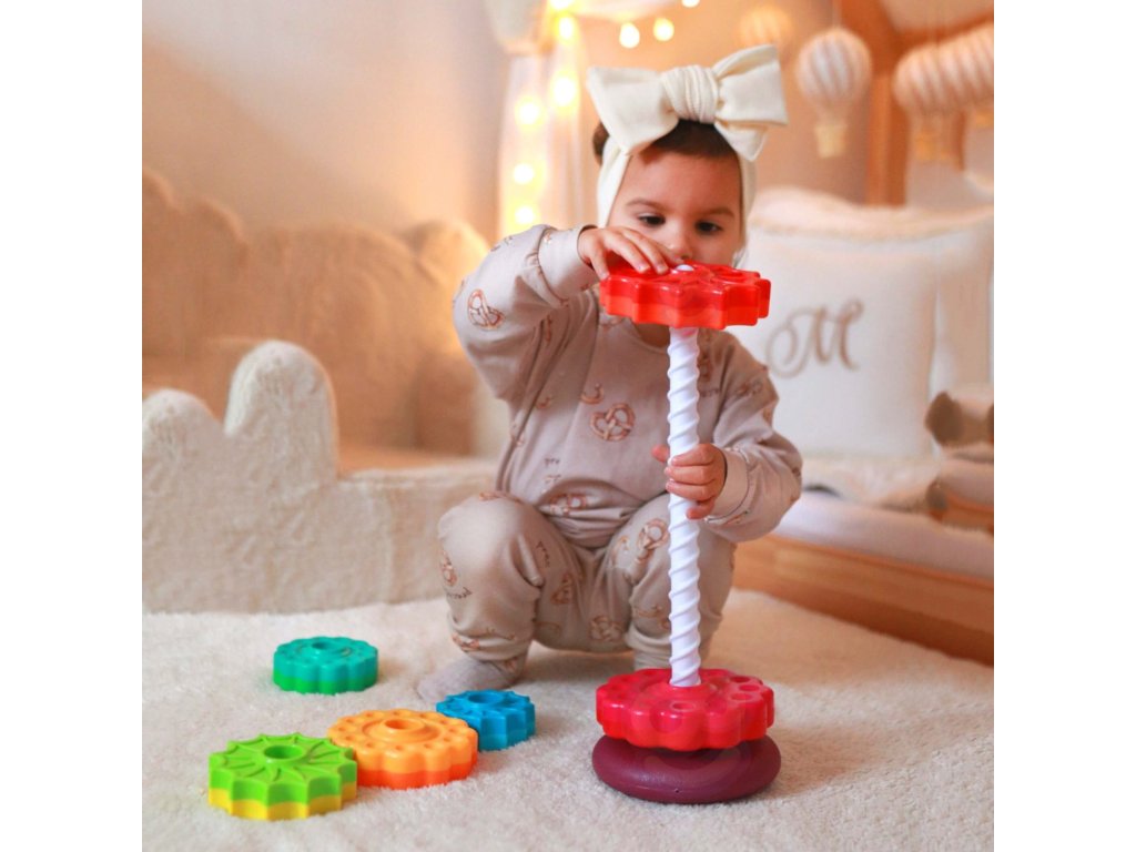 Skrútená veža od značky WOOPIEje jedinečná hračka pre deti, ktorá batoľatá uvádza do sveta fascinujúcich farieb, tvarov a pohybu. Skladá sa z farebných dielikov, ktoré sa nasadzujú na tyč skrutkovaním. Táto pyramída nielen zabáva, ale aj vzdeláva, podporujekomplexný rozvoj dieťaťa. Vďaka robustnej konštrukcii z bezpečných materiálov poskytuje krútená vežatrvalý ibezpečná hračka, ktorá určite záujmu Vaše dieťatko celé hodiny. Sada sa skladá zo 6 diskov rôznych farieb a tvarov a tyče umiestnenej na stojane. Prvky sú dvojfarebné, aby spestrili skladanie diskov do veže rôznymi spôsobmi. Zostavovanie pyramídy vyžaduje od dieťaťa logické myslenie iplánovanie ďalšie kroky.