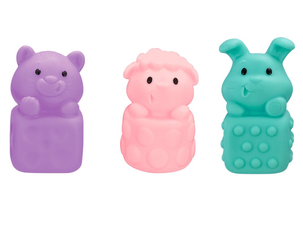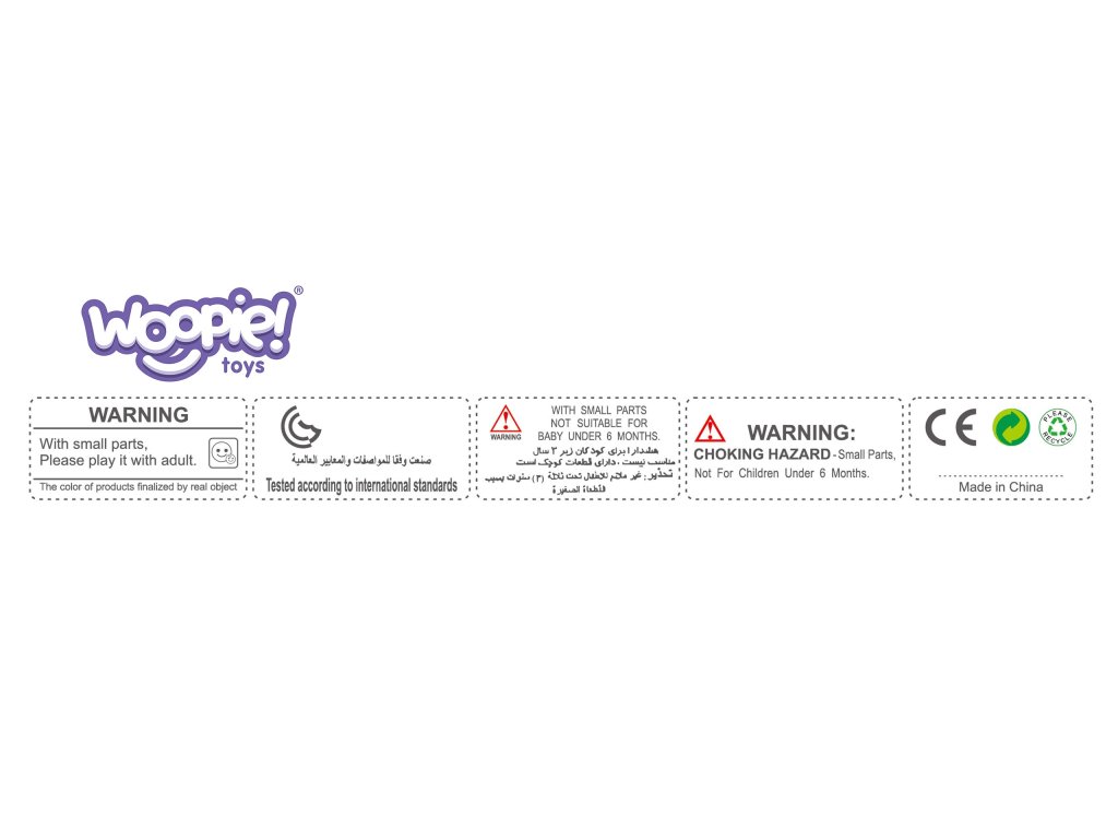 Gumové zmyslové zvieratá od značkyWOOPIEhrať sa svo vode. Zvieratká ako hroch, ovca, králik, mačiatko, žaba a pes sú vyrobené z mäkkej gumy a majú otvor, cez ktorý môžetepostrek vodou. Každé zo zvierat je umiestnené na stojane, ktorý mázáložky.