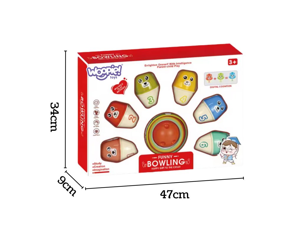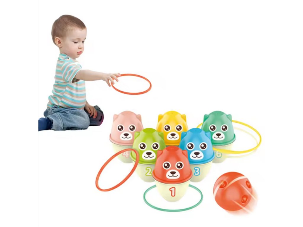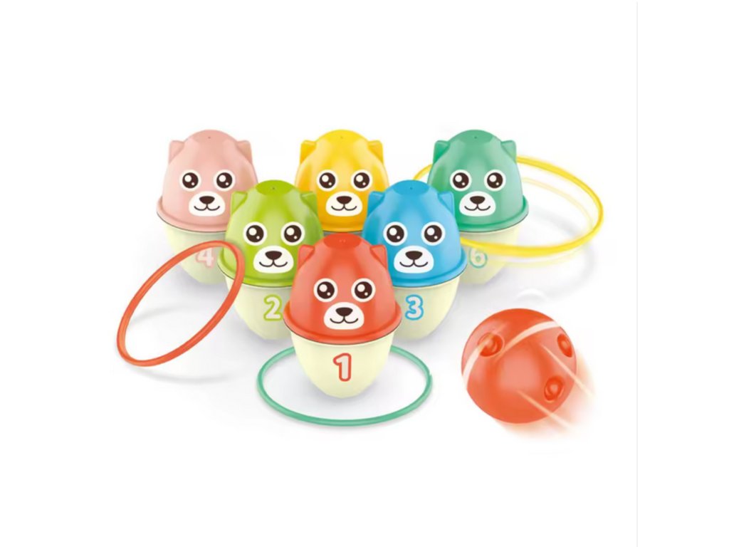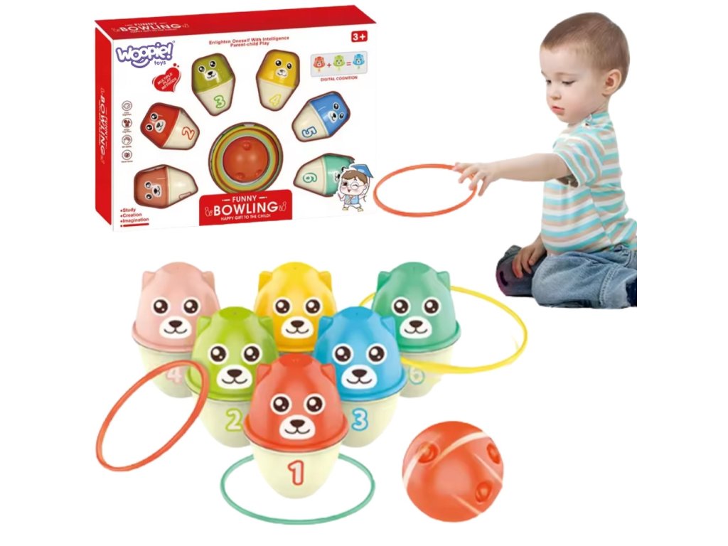 Detský bowling Farebné medvede odWoopie je inovatívna vzdelávacia hračka, ktorá spája zábavu pri hraní bowlingu s učením sa prostredníctvom činnosti. Súprava pozostáva z farebných očíslovaných medvedíkov, ktorí slúžia ako kolky, ako aj z guľôčok, ktoré sa dajú zrážať, a obručí, ktoré sa dajú hádzaťmnoho rôznych možností hry. Každý medveď má inú farbu a číslo, čo umožňuje dieťaťuvýučba rozpoznávania farieb a čísel. Hádzaním lopty alebo obruče na medvedíky si dieťa precvičujekoordinácia oko-ruka, presnosť pohybov a plánovanie činností. Vďaka atraktívnemu tvaru a rôznym funkciám je súprava ideálna na samostatnú hru aj na spoločné trávenie času s rodičmi alebo rovesníkmi. Hračka je vyrobená zodolné materiály bezpečné pre detiktoré sú príjemné na dotyk a odolné voči poškodeniu. Plyšové medvede môžu byť tiežstoh vo veži, ktoré sa ukladajú jedna do druhej ako šálky. Rôzne herné režimy - hádzanie obručou, kolky, počítanie čísel - zabezpečia, že sa dieťatko nielen zabaví, ale aj intenzívne učí. Je to ideálny darček pre každé dieťa, ktorý zaručuje nielen úsmev, ale ajaktívny rozvoj kognitívnych, manuálnych a sociálnych zručností. Ideálne pre domácnosť, škôlku, materskú školu alebo rodinné výlety.