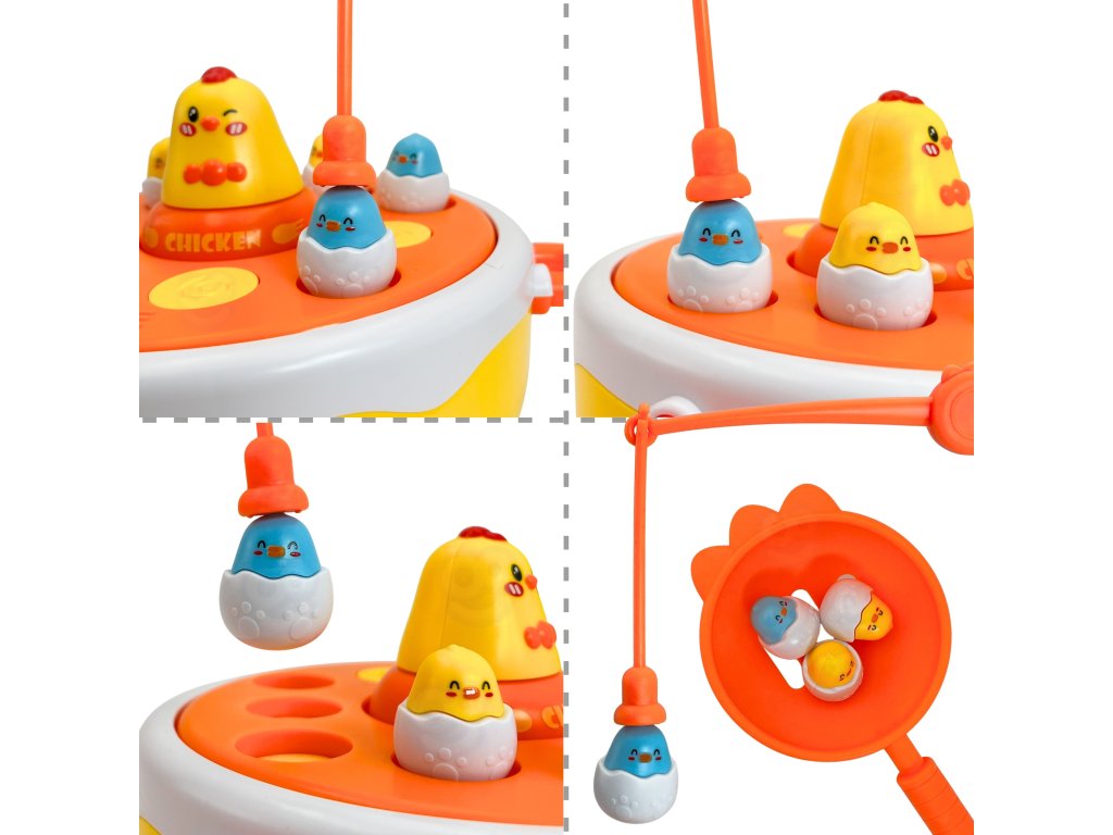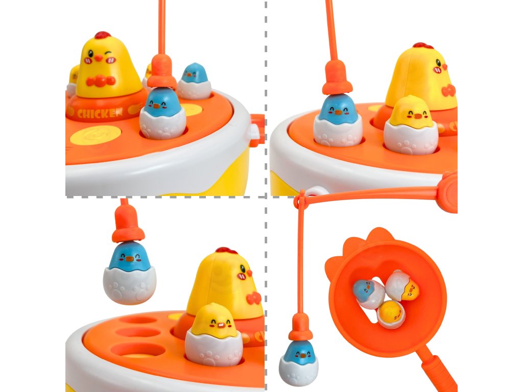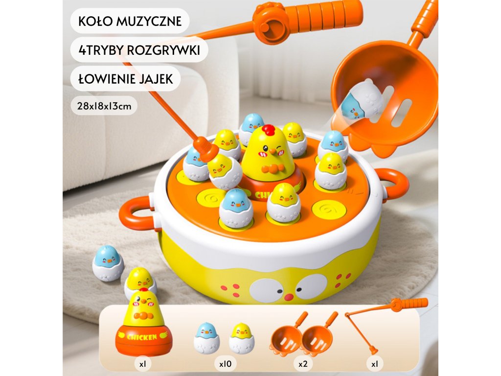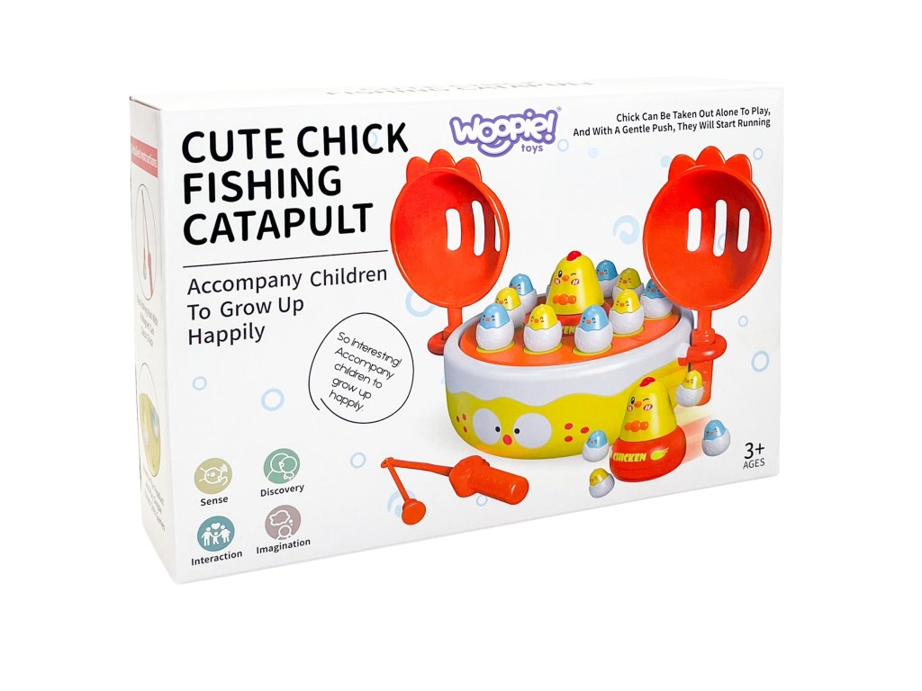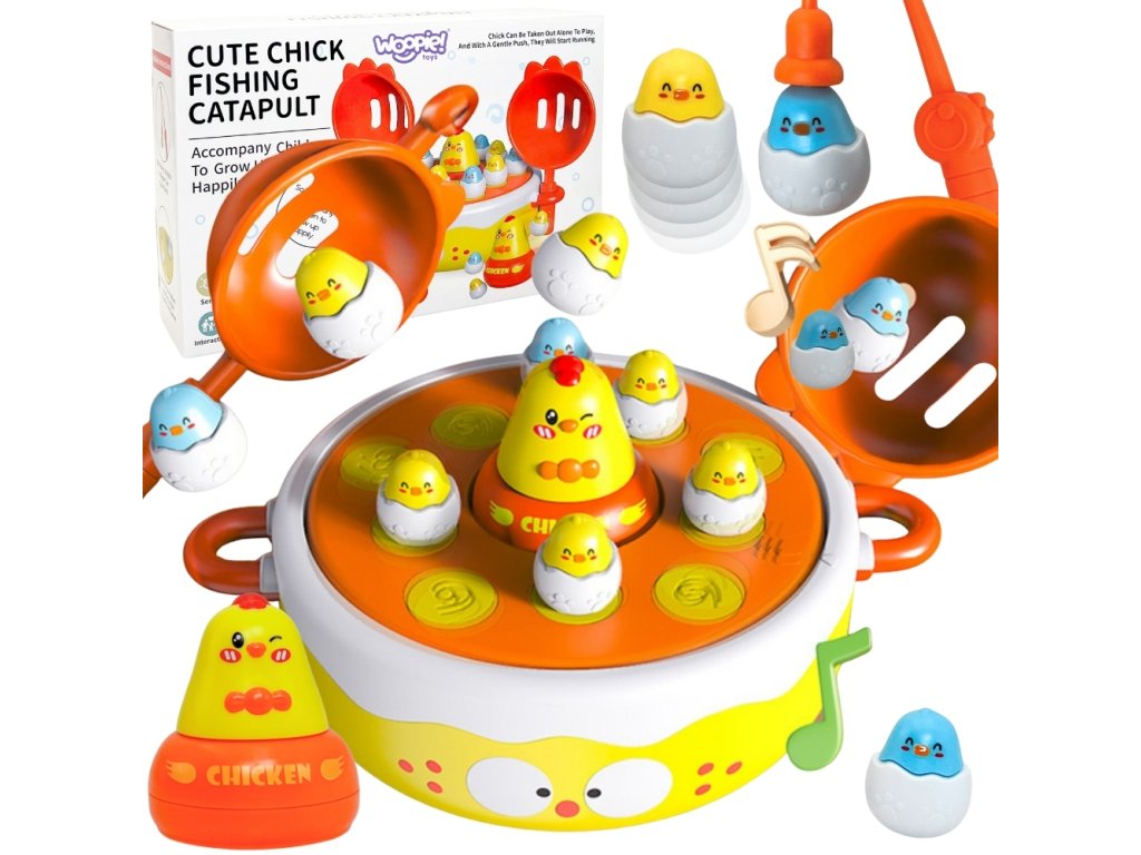 Pripravte sa na svet zábavy a učenia s touto hrou"Happy Chicks" z adresyWoopie! Táto návyková hračka4w1 umožňuje deťomchytanie mláďat rybárskym prútom,úlovok špachtľou povypúšťanie katapultov, dodržiavaťtočiace sa kurčatá na hudobnom diskualebo dokonca použiť väčšie kurčaako auto. Navyše sa na zadnej strane základne nachádza hracia doska na hraniekoleso a kríž, vďaka čomu sú "Veselé kuriatka" univerzálnou hračkou ideálnou na spoločnú hru, ktorá podporuje rozvoj zručnosti, sústredenia a tvorivosti.
