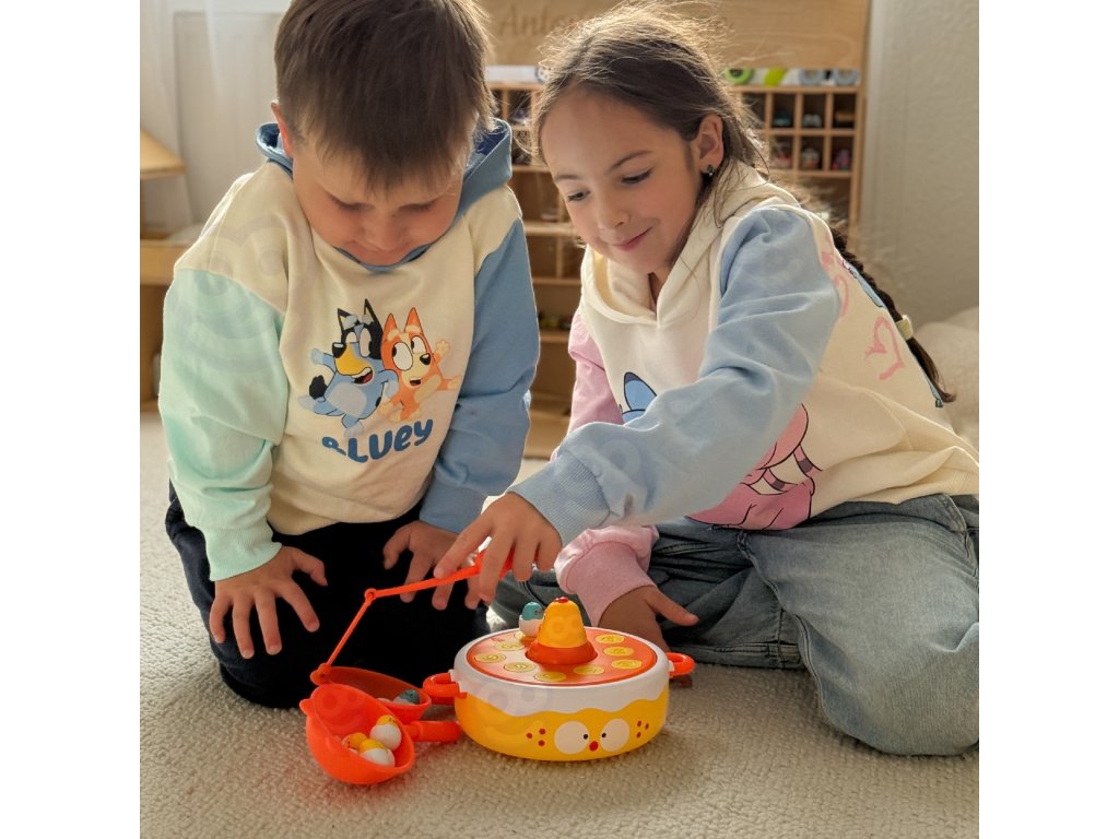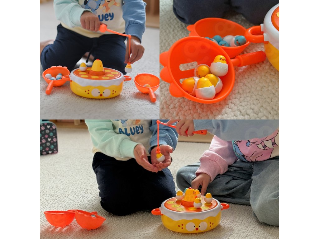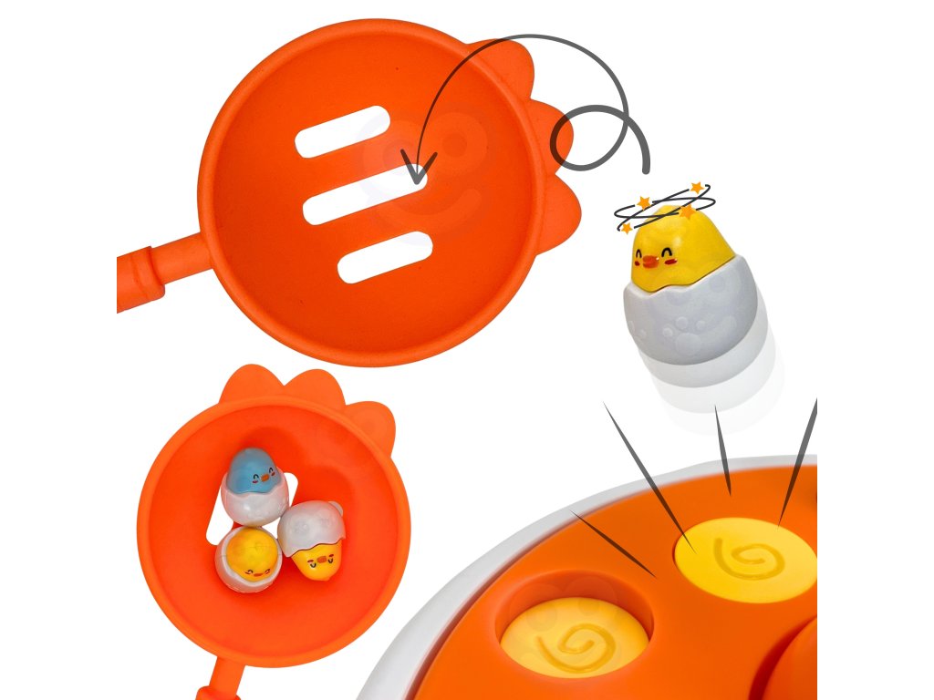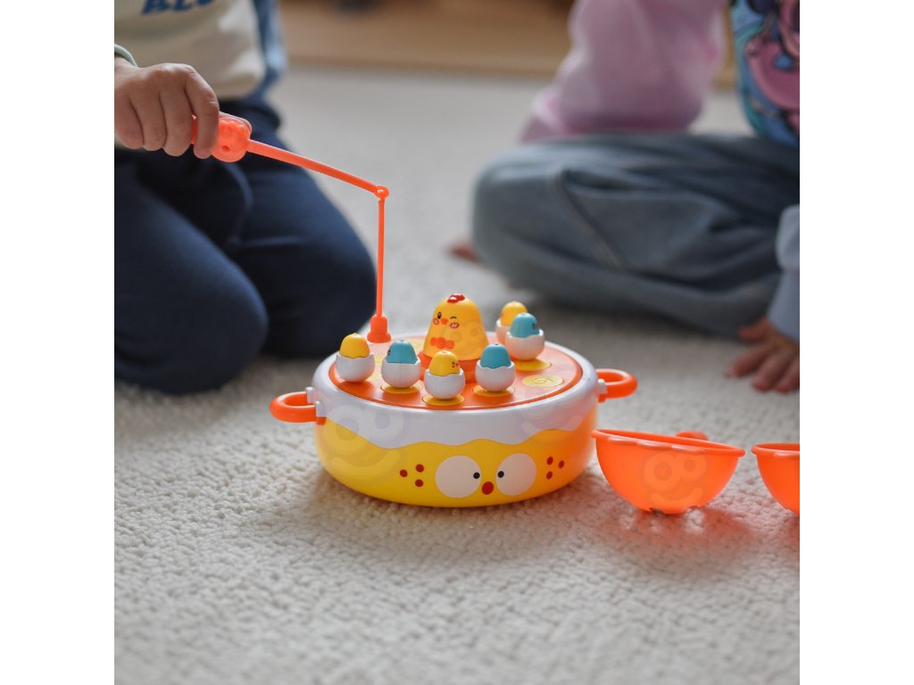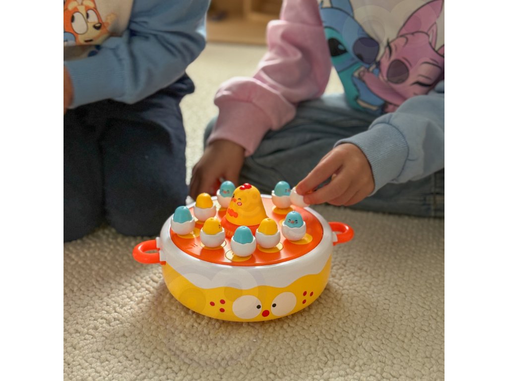Pripravte sa na svet zábavy a učenia s touto hrou"Happy Chicks" z adresyWoopie! Táto návyková hračka4w1 umožňuje deťomchytanie mláďat rybárskym prútom,úlovok špachtľou povypúšťanie katapultov, dodržiavaťtočiace sa kurčatá na hudobnom diskualebo dokonca použiť väčšie kurčaako auto. Navyše sa na zadnej strane základne nachádza hracia doska na hraniekoleso a kríž, vďaka čomu sú "Veselé kuriatka" univerzálnou hračkou ideálnou na spoločnú hru, ktorá podporuje rozvoj zručnosti, sústredenia a tvorivosti.