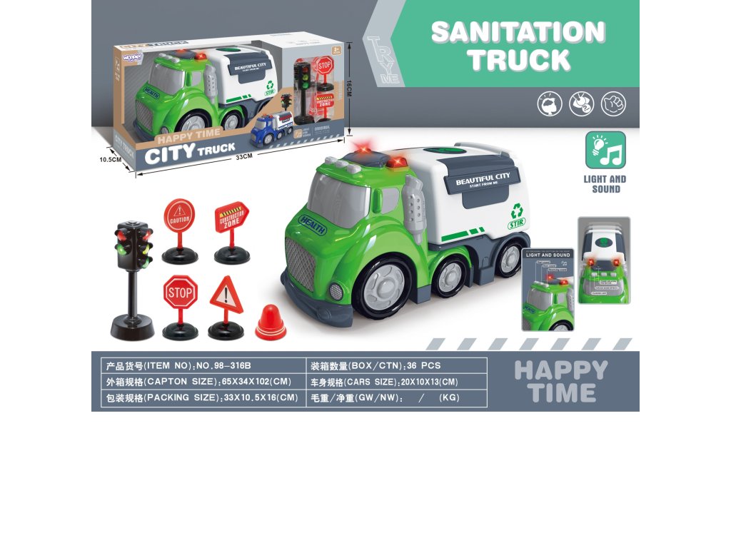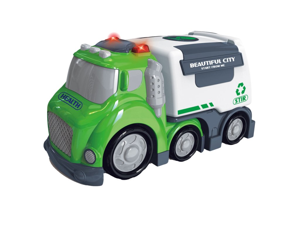 Sanitárne smetiarske auto zo série CITY TRUCK je ideálna hračka pre každého malého fanúšika motorizmu a mestských špeciálnych vozidiel. Súprava obsahuje realisticky reprodukované smetiarske auto vyrobené z odolného plastu, vybavené svetelnými a zvukovými efektmi, ktoré sa aktivujú stlačením tlačidla na streche vozidla. Hračka sa dodáva s príslušenstvom, ako je semafor, dopravné značky a stĺpik.