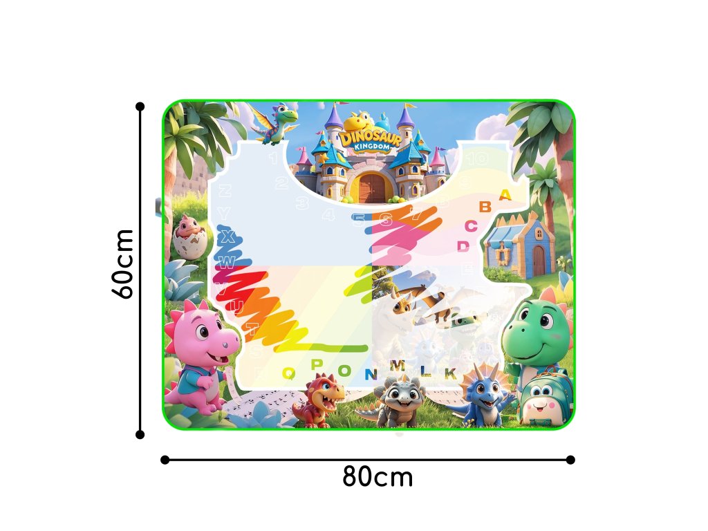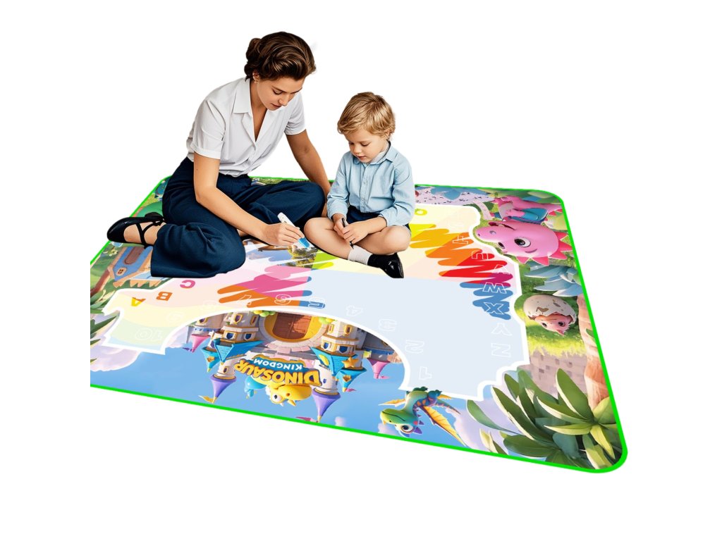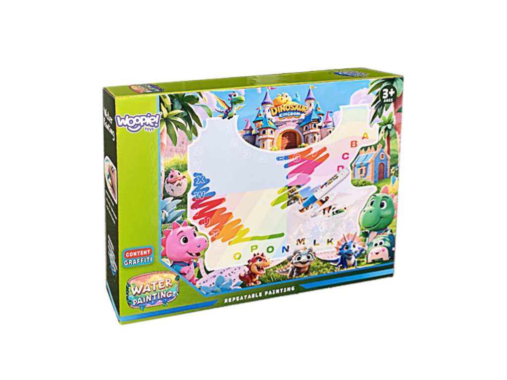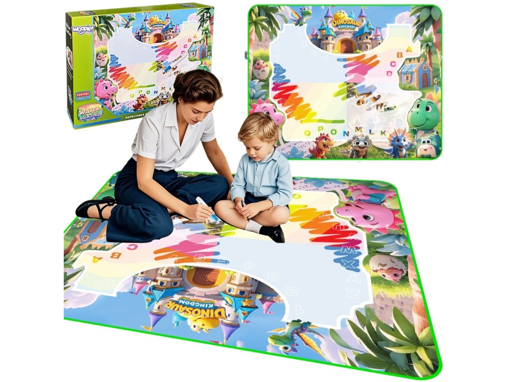Magický,veľká vodná rohož od značkyWoopie je ideálny spôsob, akokreatívna hra bez neporiadku. Jednoducho naplňte perá vodou afarby sa na podložke objaví ako mávnutím čarovného prútika! Keď rohož zaschne,kresba zmizneaby sa zábava mohla začať odznova. Je to skvelé riešenie, ktoré dieťaťu umožňujerozvíjať umelecké zručnosti bez rizika znečistenia oblečenia, nábytku alebo stien. Podložka smotív dinosaura a hradu uvedie batoľa do fantastického sveta kreslenia. Sada obsahujerôzne príslušenstvoako naprperáktoré možno použiť na maľovanie, ahubkové pečiatkyktoré umožňujú vytvárať ďalšie tvary. Veľká veľkosť podložky podporujespoločne sa zabávať so súrodencami alebo rodičmi. Výrobok jebezpečné a opakovane použiteľné.