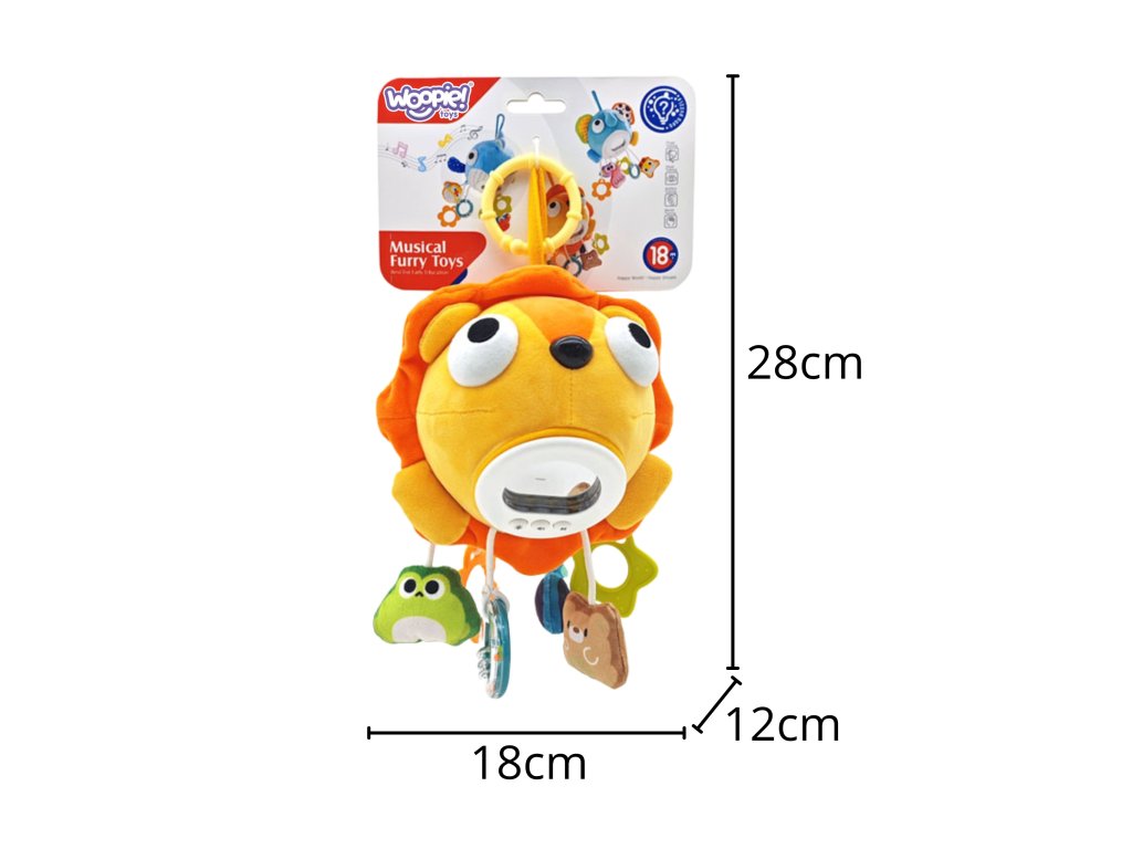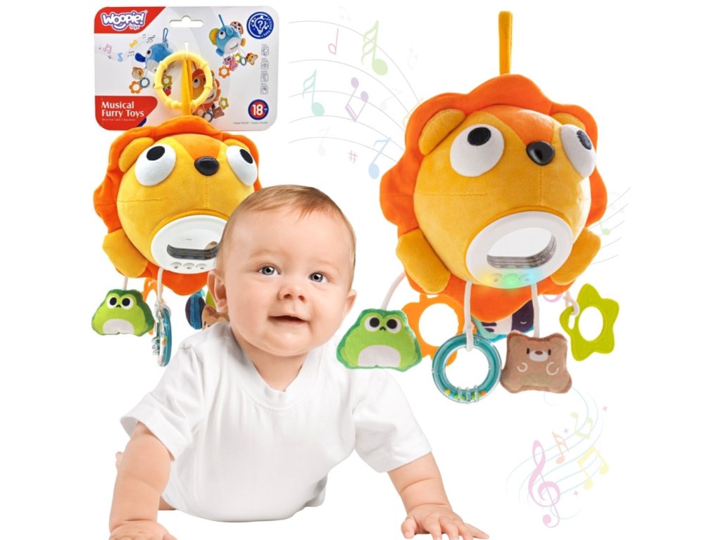 Plyšový,hudobný lev od značky Woopie je dokonalým spoločníkom na spanie a hranie pre každé dieťatko. Kombináciatichá hudba, upokojujúce svetlá a rôzne textúry je hračka vynikajúcim nástrojom na stimuláciu zmyslov dieťaťa a poskytuje mu pocit bezpečia. Hračka má tvar rozkošného plyšového leva so zrkadielkom. K jeho trupu je pripojených šesť ,rôzne závesy v rôznych tvaroch. Dve z nich sú bezpečným hryzátkom, jedna slúži ako hrkálka a ostatné hravé plyšáky stimulujúmotorický a senzorický vývoj dieťa. Hračku možno vďaka praktickému držadlu ľahko zavesiť na postieľku, kočík alebo autosedačku a poskytuje zábavu a upokojenie v každej situácii.