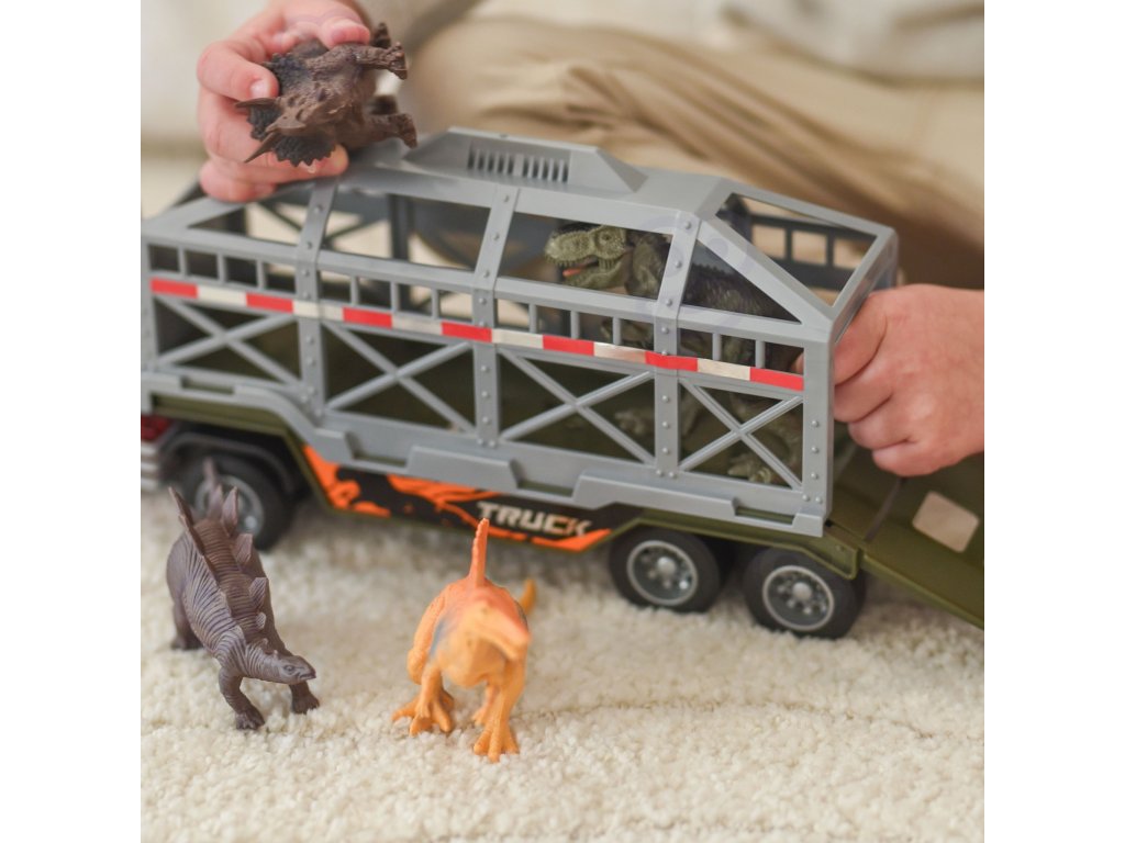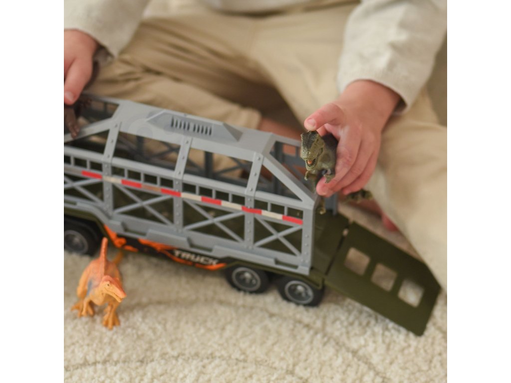 Dinosaur Transporter Truck od značkyWOOPIEje ideálny pre všetkých malých fanúšikov prehistorických tvorov a motorizmu. Táto pôsobivá súprava kombinuje veľkénákladné vozidlo s prívesom afigúrky dinosaurovposkytuje hodiny tvorivej hry. Vozidlo je vybavenétrecí pohonovláda sa veľmi jednoducho, takže keď ho stlačíte, sám sa pohne dopredu. Hravosť umocňujesvetelné a zvukové efekty: na streche kabíny sa nachádzajú 4 tlačidlá na aktiváciu zvukov motora, klaksónu, sirény a zvukov cúvania, ktoré sprevádzajú blikajúce svetlá. Príves má otváraciu klietku a sklápaciu rampu, ktorá umožňuje jednoduché nakladanie a vykladanie dinosaurov. Príves sa dá od traktora odpojiť aj pre ďalšie možnosti hry.