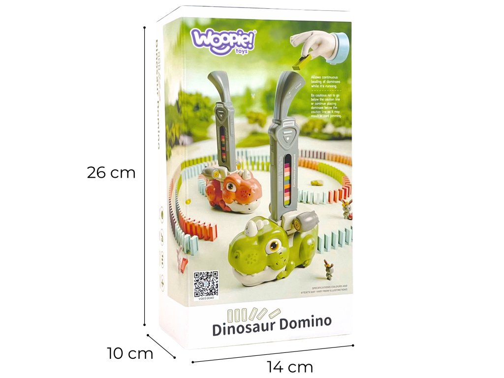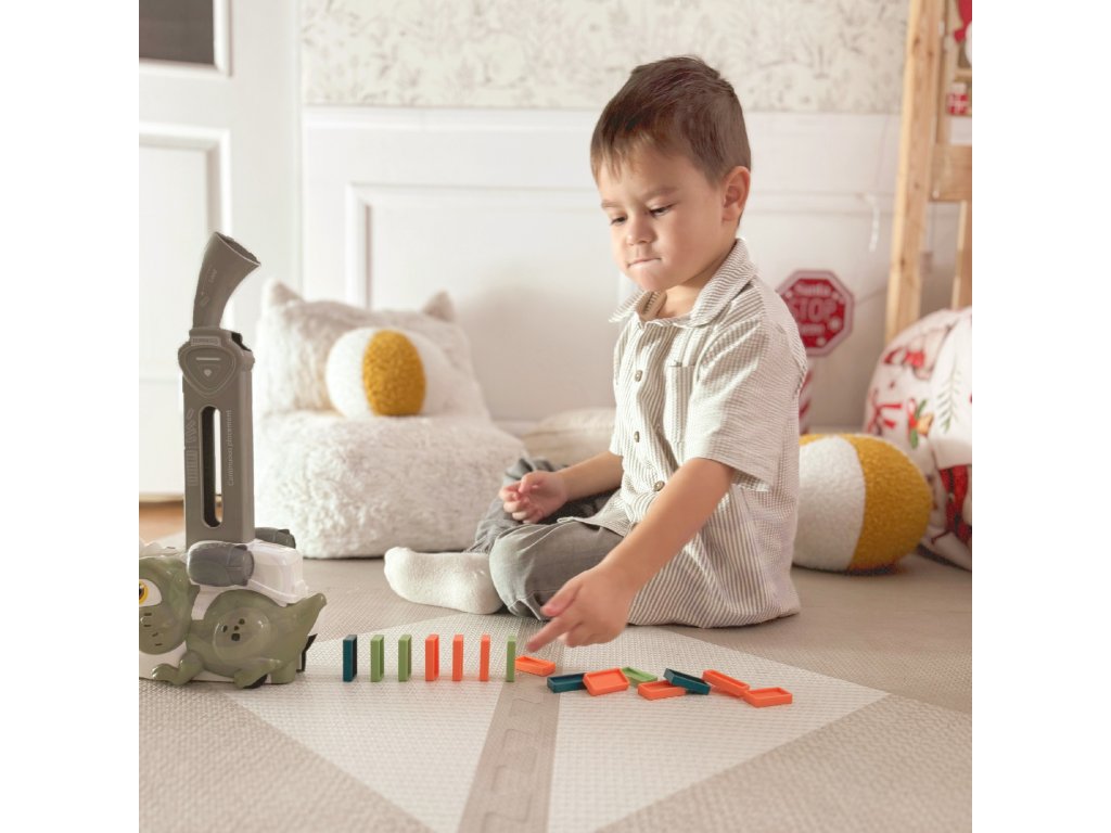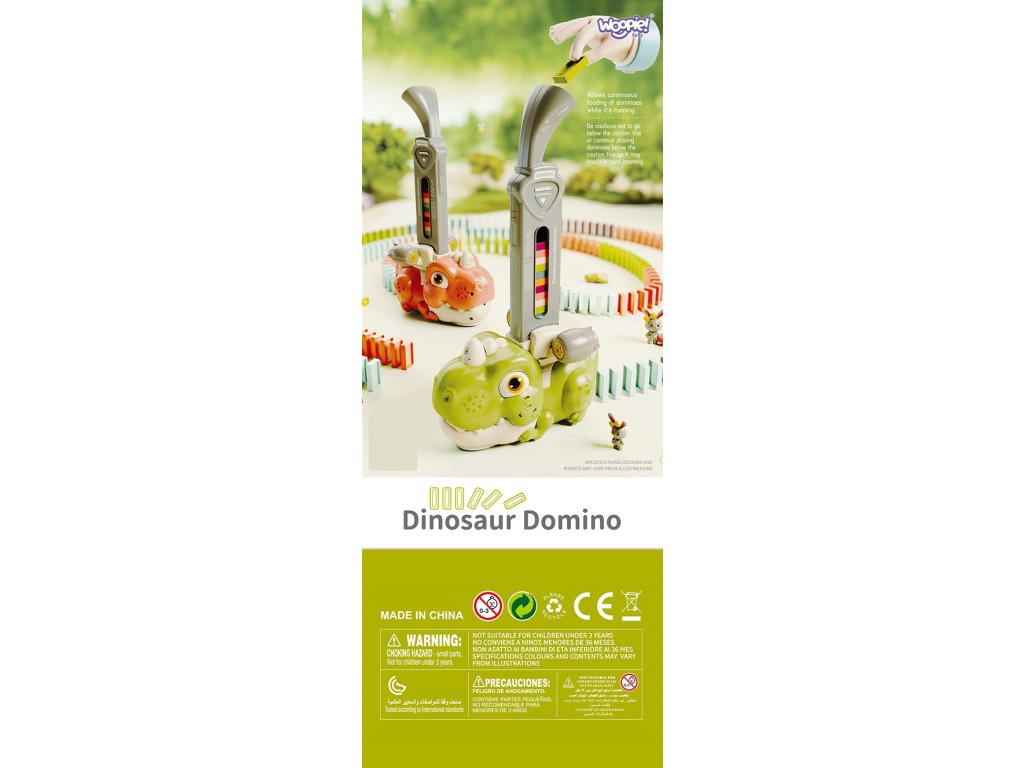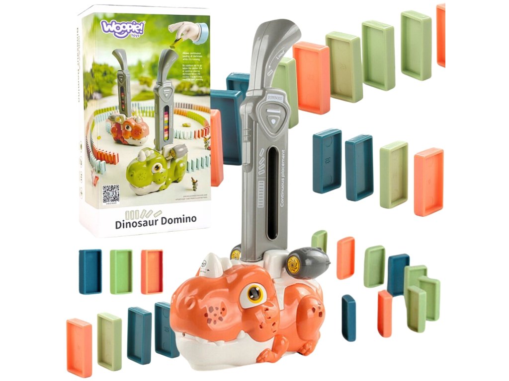 Farebné domino s dinosaurami od značkyWOOPIE je hra, ktorá kombinuje hračkárske vláčiky a domino a vytvára tak príjemný a originálny spôsob hry.Zvuk a osvetlenie robí hru zábavnejšou a atraktívnejšou a podnecuje záujem detí o hru. Ak chcete spustiť hru, jednoduchonaplňte zásobník kockami domina, začnite hrať a užívajte si tento proces. Vlak je navyše sprevádzaný výraznými zvukmi a podsvietením, čo hre dodáva ešte väčšiu dynamiku.