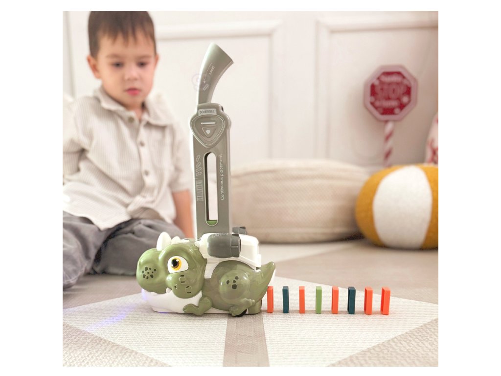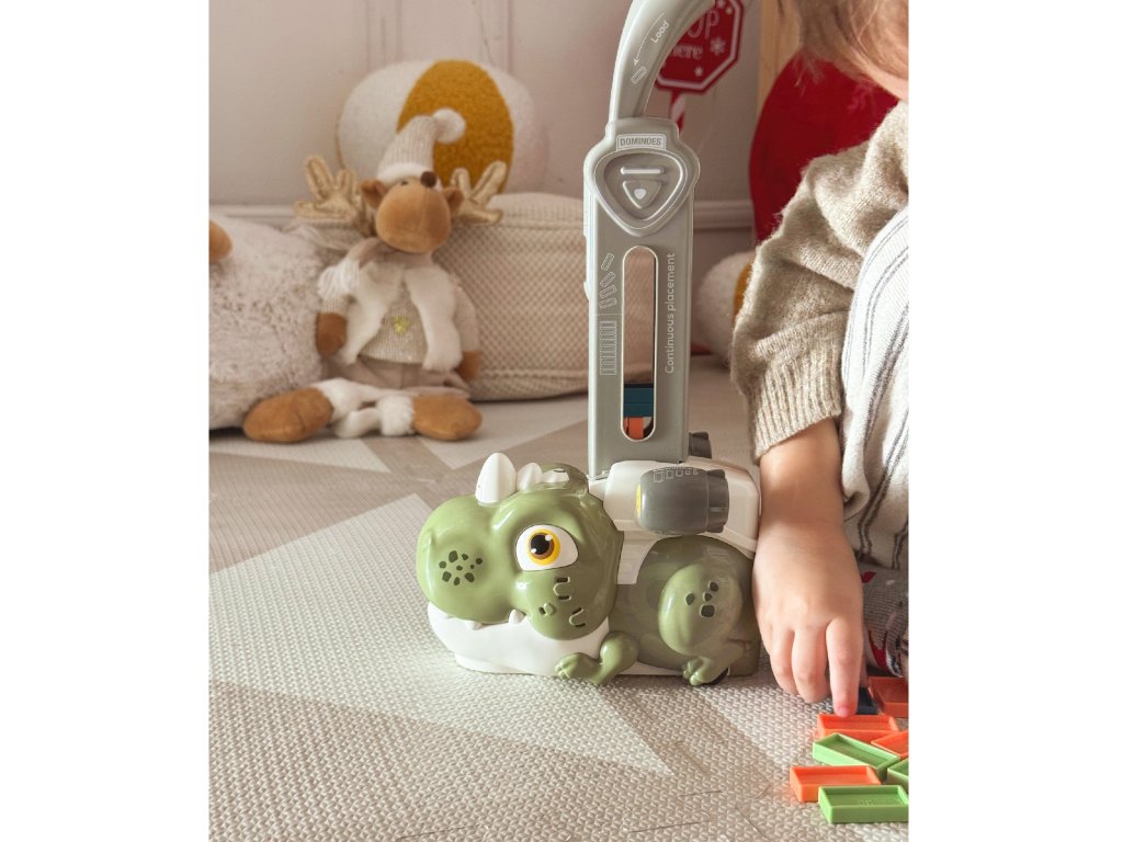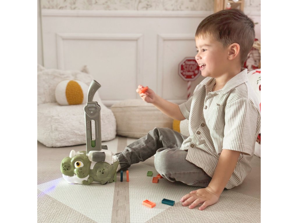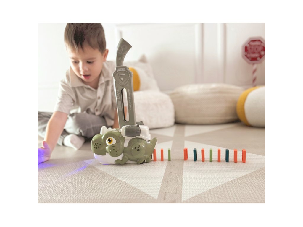 Farebné domino s dinosaurami od značkyWOOPIE je hra, ktorá kombinuje hračkárske vláčiky a domino a vytvára tak príjemný a originálny spôsob hry.Zvuk a osvetlenie robí hru zábavnejšou a atraktívnejšou a podnecuje záujem detí o hru. Ak chcete spustiť hru, jednoduchonaplňte zásobník kockami domina, začnite hrať a užívajte si tento proces. Vlak je navyše sprevádzaný výraznými zvukmi a podsvietením, čo hre dodáva ešte väčšiu dynamiku.