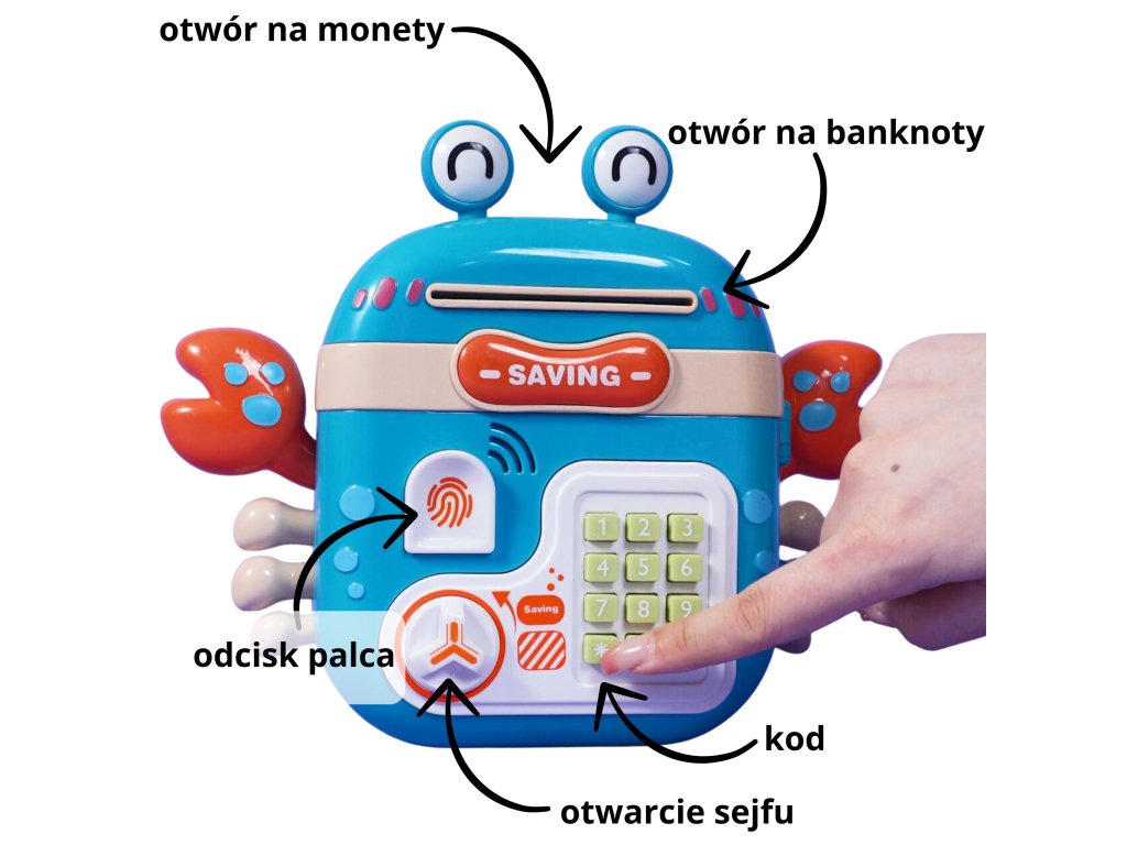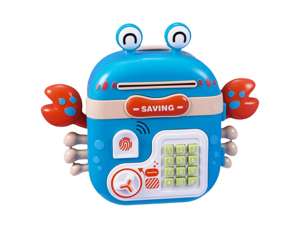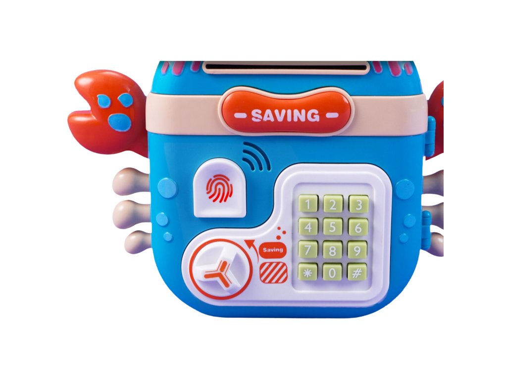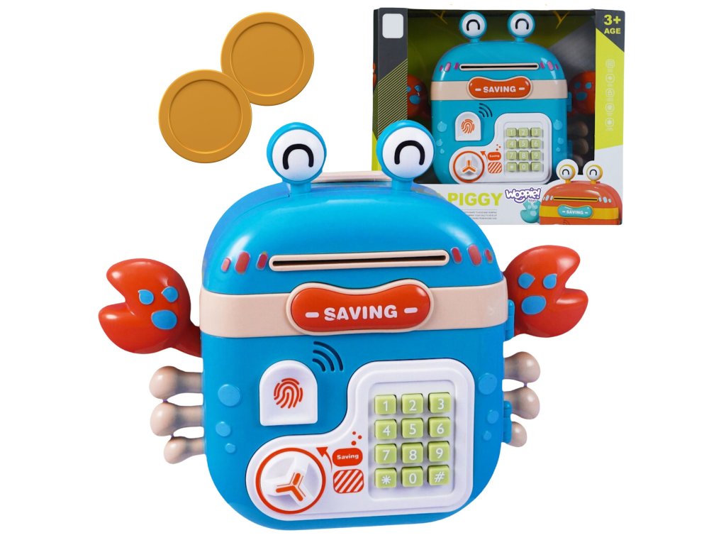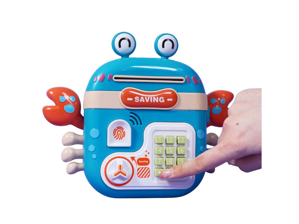 Elektronická pokladnička na Kód od značky WOOPIE je multifunkčný výrobok, ktorý vaše dieťa určite poteší! Krab je navrhnutý tak, aby ste mohli uložiť mince, bankovky a iné menšie hračky. Pokladnička sa skladá zo špeciálnych otvorov na bankovky a mince, čítačka odtlačkov prstov, klávesnice na písaniekód agombíky na otváranie. Elektronický krab navyše vydáva zvuky! V prípade potreby možno hračku ľahko resetovať a nastaviť nový kód