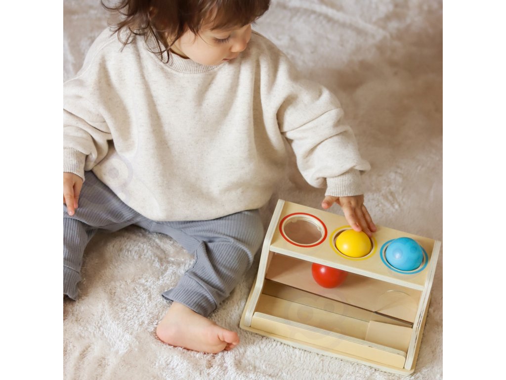 - - Zmysel pre sluch - zvuky činelov a kotúľajúcich sa loptičiek stimulujú rozvoj sluchu a učia rozpoznávať tóny a rytmy