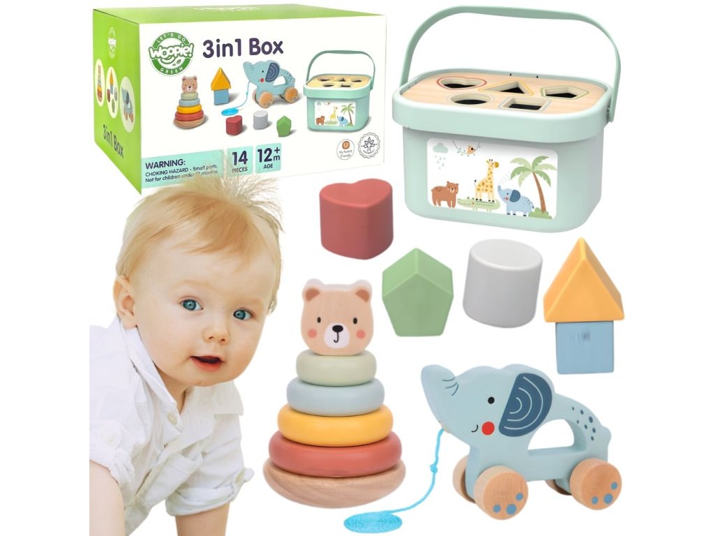 Súprava 3 v 1 z adresyWOOPIE GREEN je klasický avšestranná vzdelávacia hračkaktorá poskytuje batoľatám mnoho foriem hry a učenia. Súprava obsahuje triedičku s kockami, pyramídového medveďa a slona, ktorého môžete tlačiť a ťahaťvšetky sú vyrobené z bezpečných materiálov a navrhnuté s ohľadom na malé ruky. Hračky sa dajú pohodlne uložiť douzamykateľný boxs rukoväť na prenášanie.
