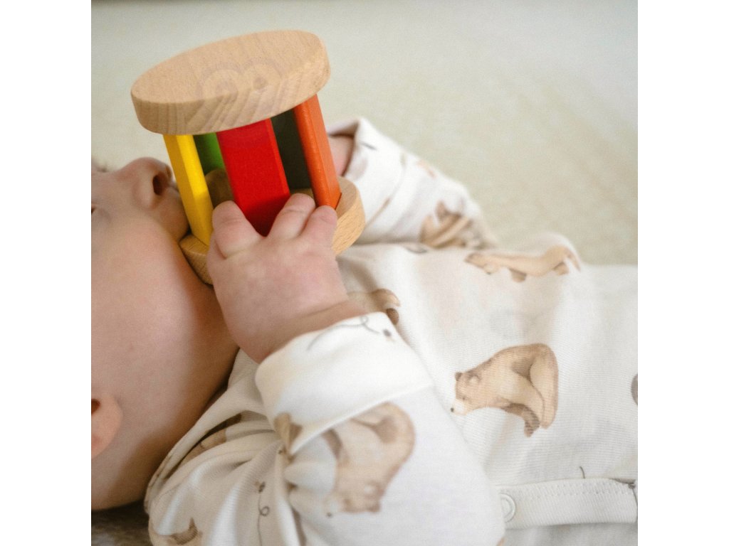 - - Farebná drevená hrkálka určená na kotúľanie a uchopenie