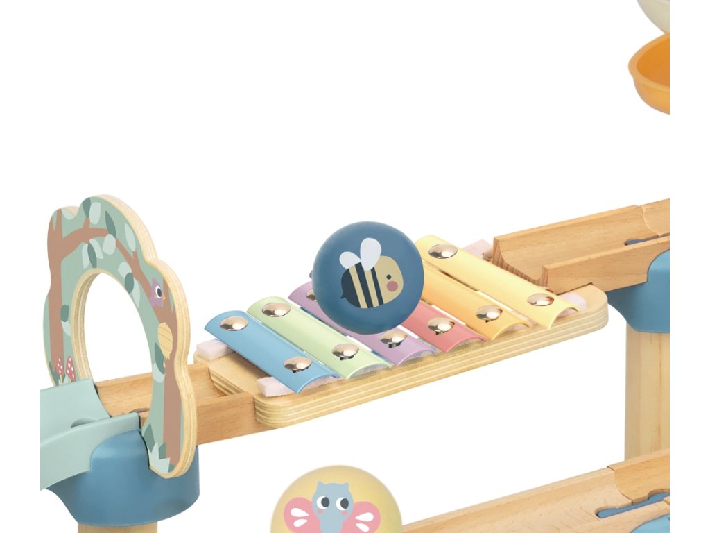 - - Hudobné prvky - zabudovaný mini nástroj (cimbal) umožňuje dieťaťu počuť zvuky pri kotúľaní loptičiek, čo obohacuje zážitok z hry