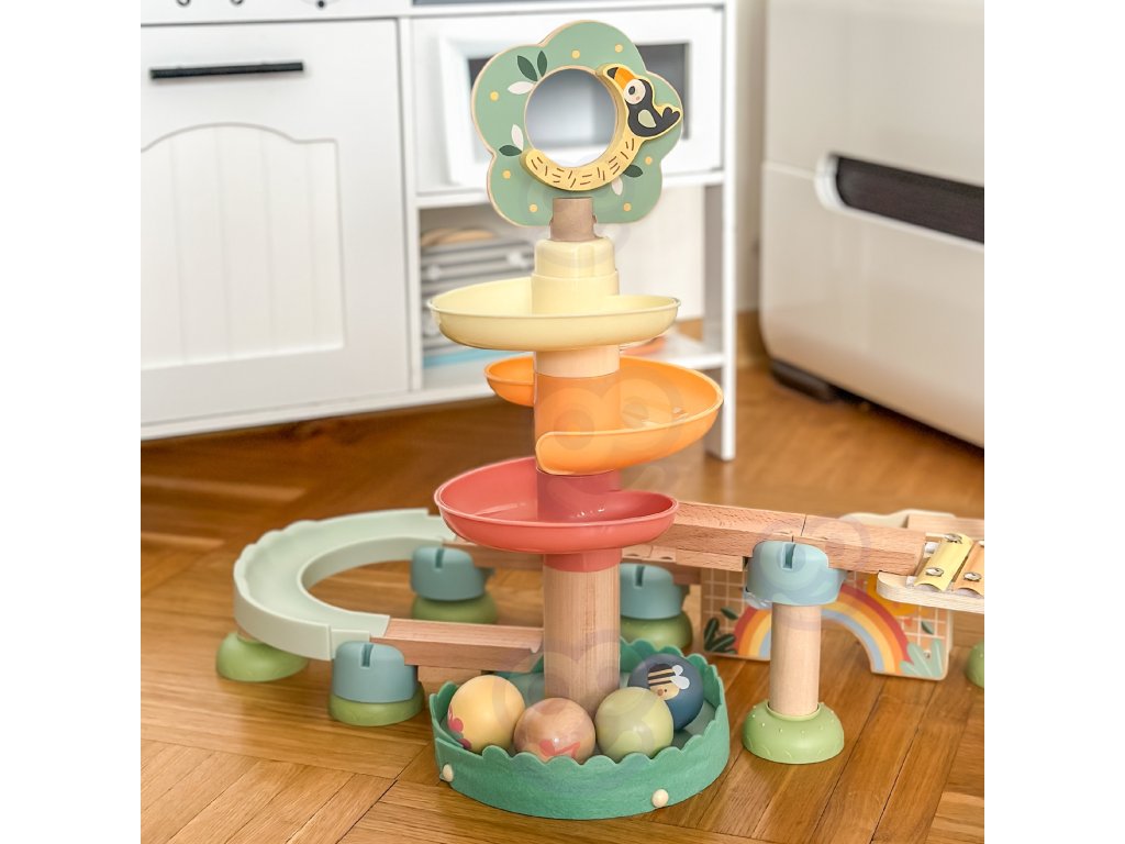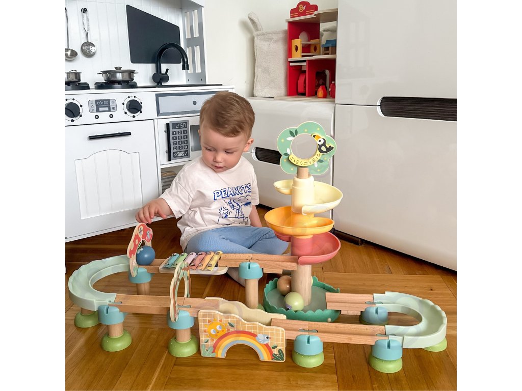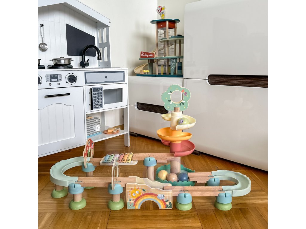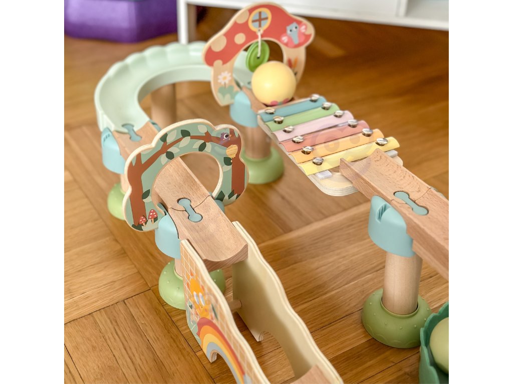 Krásnedrevená guličková dráha od Woopie Green je jedinečná hračka, ktorá kombinuje prvky pohybu, zvuku a učenia prostredníctvom hry. Je to ideálna súprava pre najmenších objaviteľov sveta, ktorí budú s radosťou sledovať, ako sa farebné guľôčky kotúľajú po dráhe, uvádzajú do pohybu rôzne prvky a vydávajú príjemné zvuky. Celá súprava je vyzdobená vpastelové, priateľské farbyktorý upúta pozornosť a vnáša do hry hrejivú, pokojnú atmosféru. Hračka poteší nielen svojím vzhľadom, ale predovšetkým funkčnosťou a kvalitou vyhotovenia - bola navrhnutá s ohľadom na rozvoj dieťaťa od útleho veku. Vďaka jej rôznym prvkom - ako napršpirálové sklíčka, mostíky, pásy a činely - dieťa môže sledovať meniace sa pohyby loptičiek, počúvať zvuky, ktoré vydávajú, a experimentovať s rýchlosťou a smerom ich kotúľania. Je to vynikajúca forma hry, ktorá rozvíja a zároveň baví. Hračka je vhodná do domácnosti, detskej izby alebo ako pútavý darček pre dieťa v dojčenskom a ranom detstve.