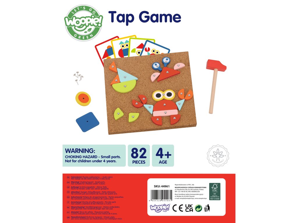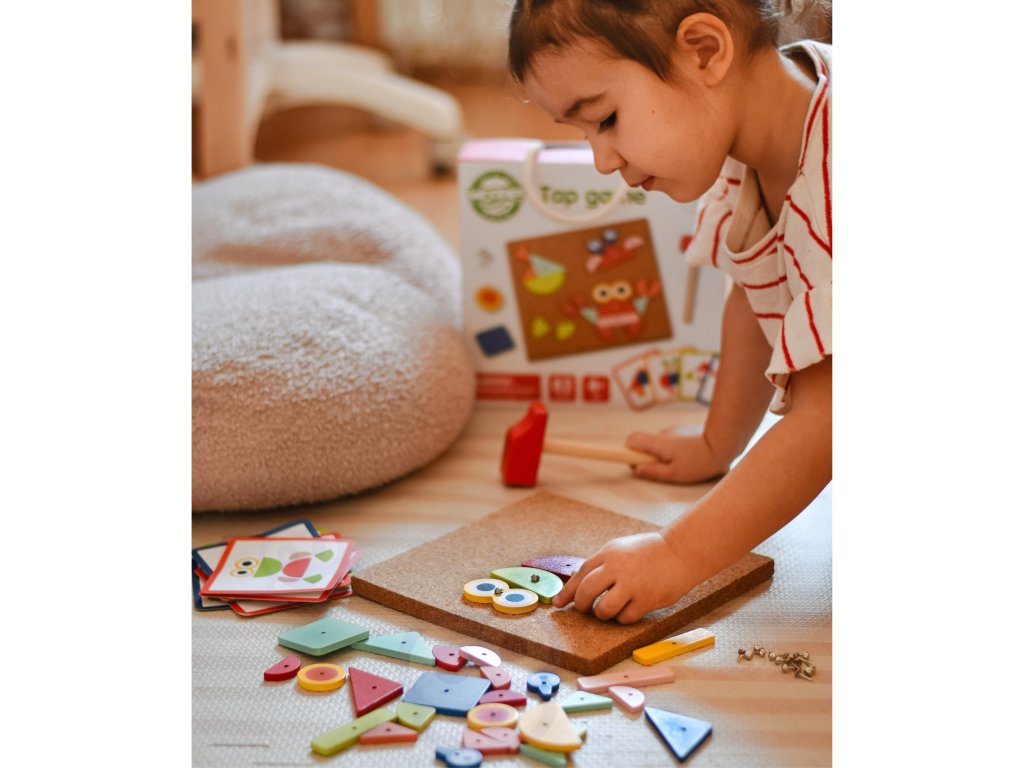 Korková klincovačka od značkyWOOPIE zo série GREEN je ideálna vzdelávacia hračka pre malého staviteľa. Deti si môžu z kartičiek poskladať vzory alebo vytvoriť vlastné rozloženie z farebných drevených dielikov. Pomocou kladivka a špendlíkov pribíjajú kocky na korkovú dosku a vytvárajú obrázky zvierat, rastlín alebo vozidiel.Tri úrovne obtiažnosti umožňujú prispôsobiť hru veku a schopnostiam dieťaťa. Je to skvelá forma učenia hrou - rozvíjamotorické zručnosti,kreativita ilogické myslenie!