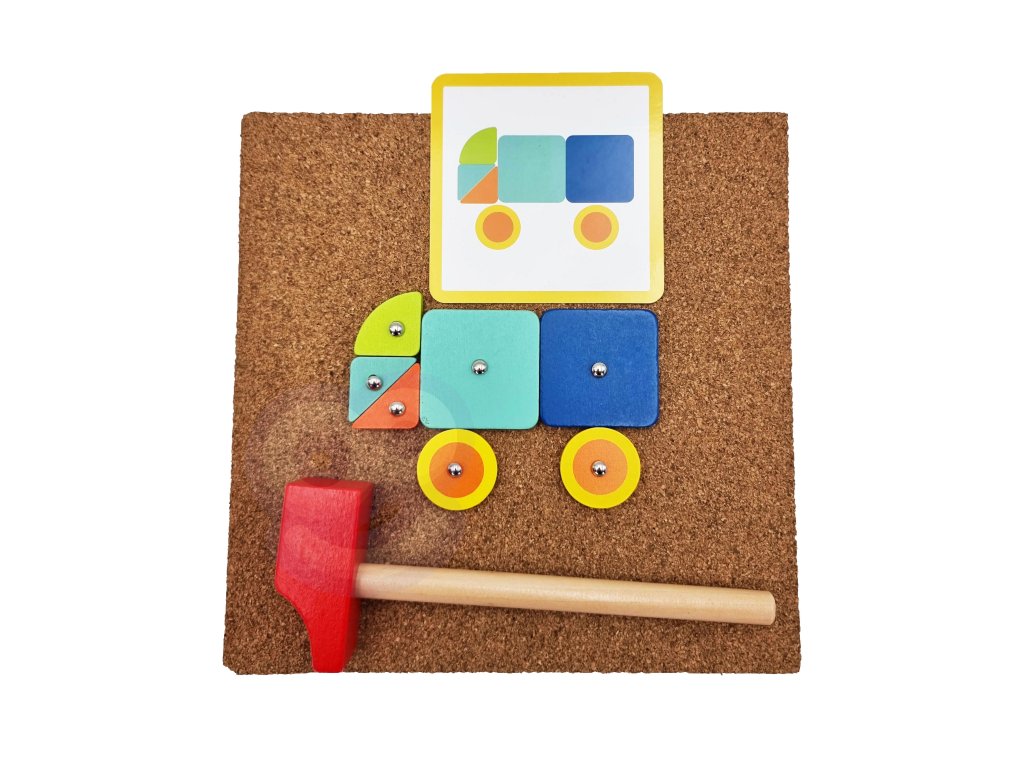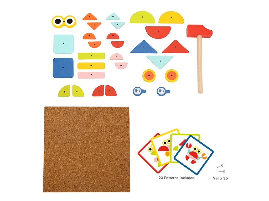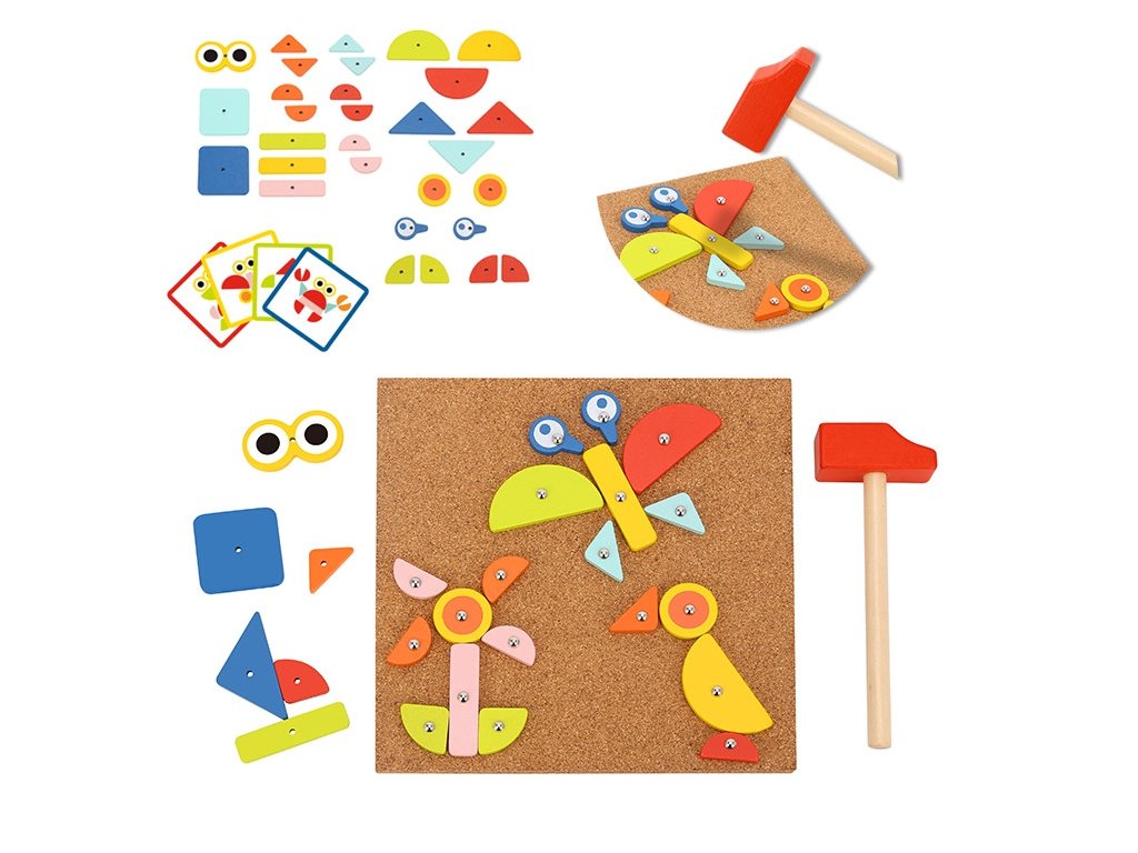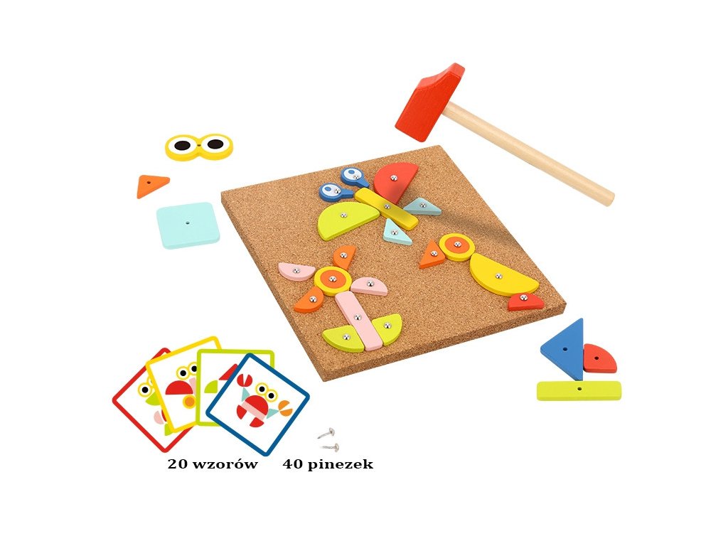 - - súprava obsahuje82 el..: 30 blokov, 40 kolíkov,10 kariet s 20 návrhov, korková tabuľaa kladivo