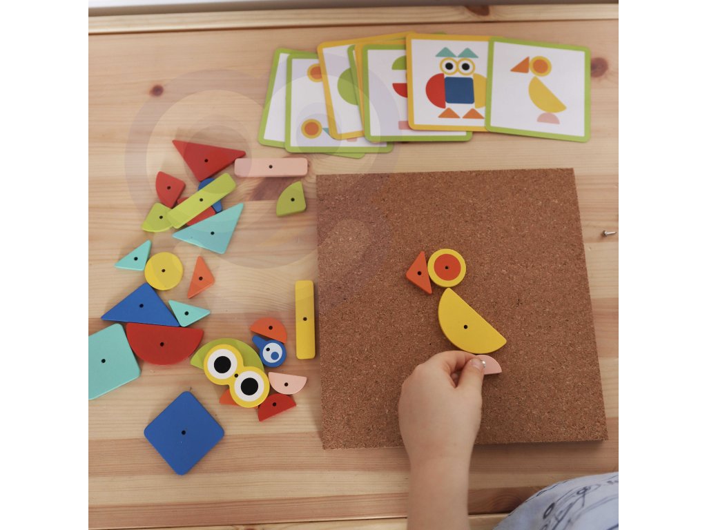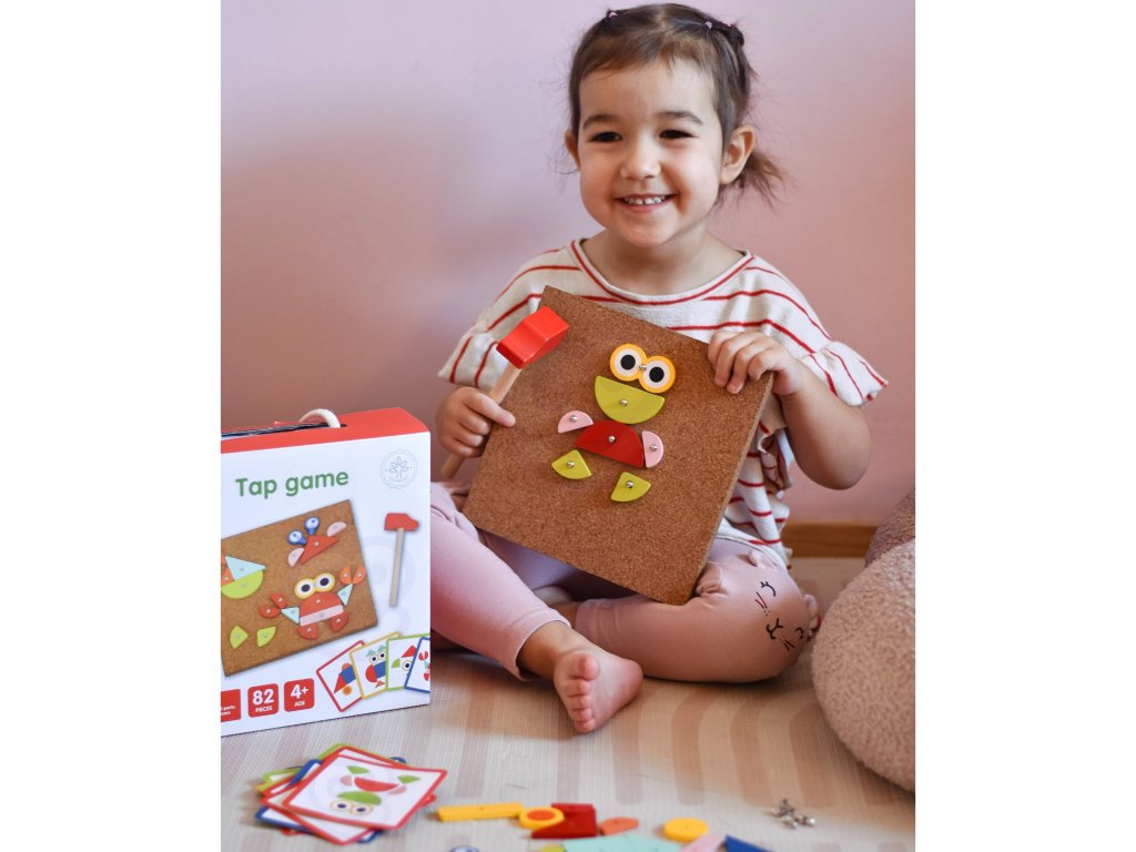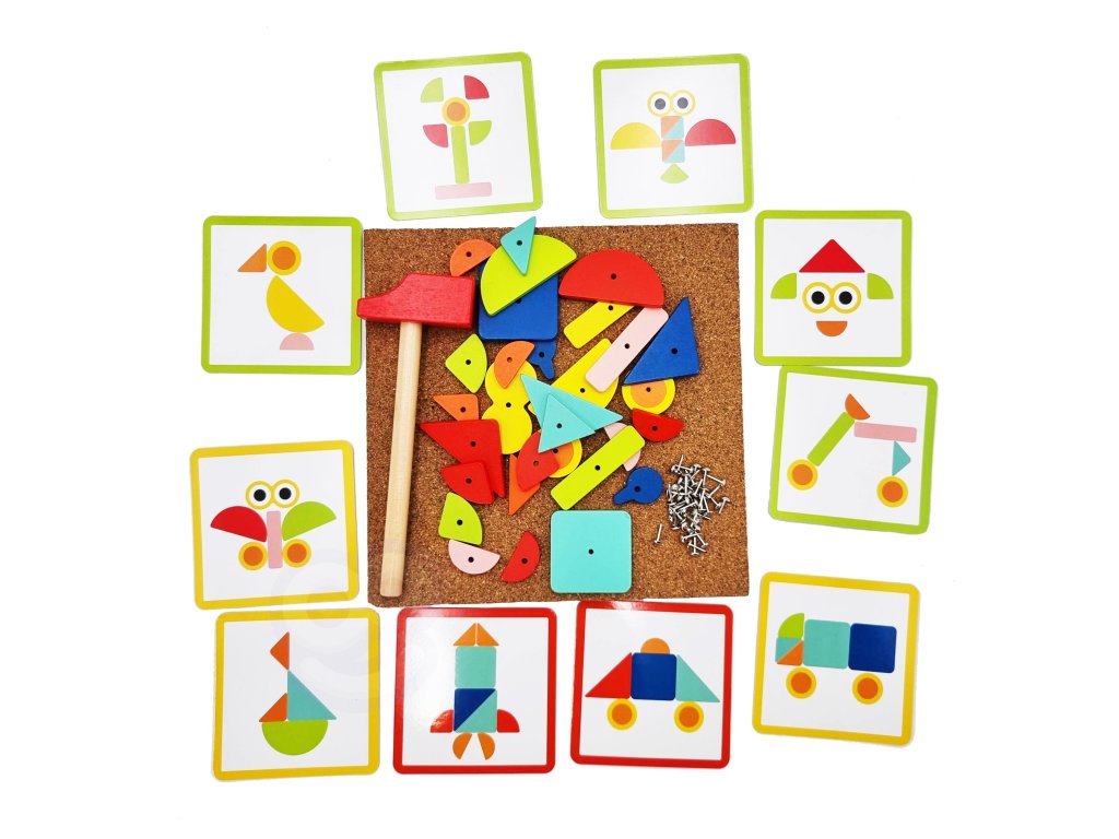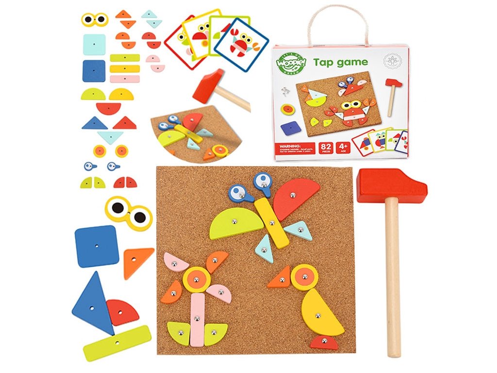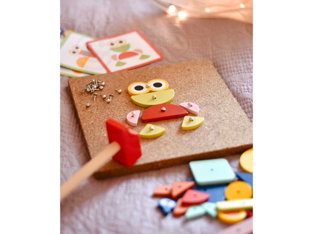 - - súprava obsahuje82 el..: 30 blokov, 40 kolíkov,10 kariet s 20 návrhov, korková tabuľaa kladivo
